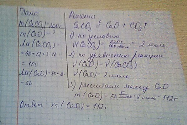 Рассчитываем количество корбоната кальция, затем по уравнению реакции количество оксида кальция. После этого можем найти массу.