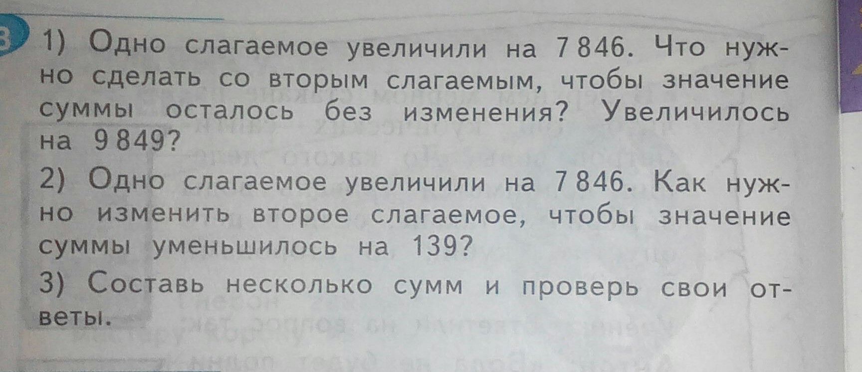 1)Чтобы сумма не изменилась, надо второе слагаемое уменьшить на это же число.Чтобы увеличилась на 9849, надо второе слагаемое увеличить на : 9849-7846=2003 - вот на это число.