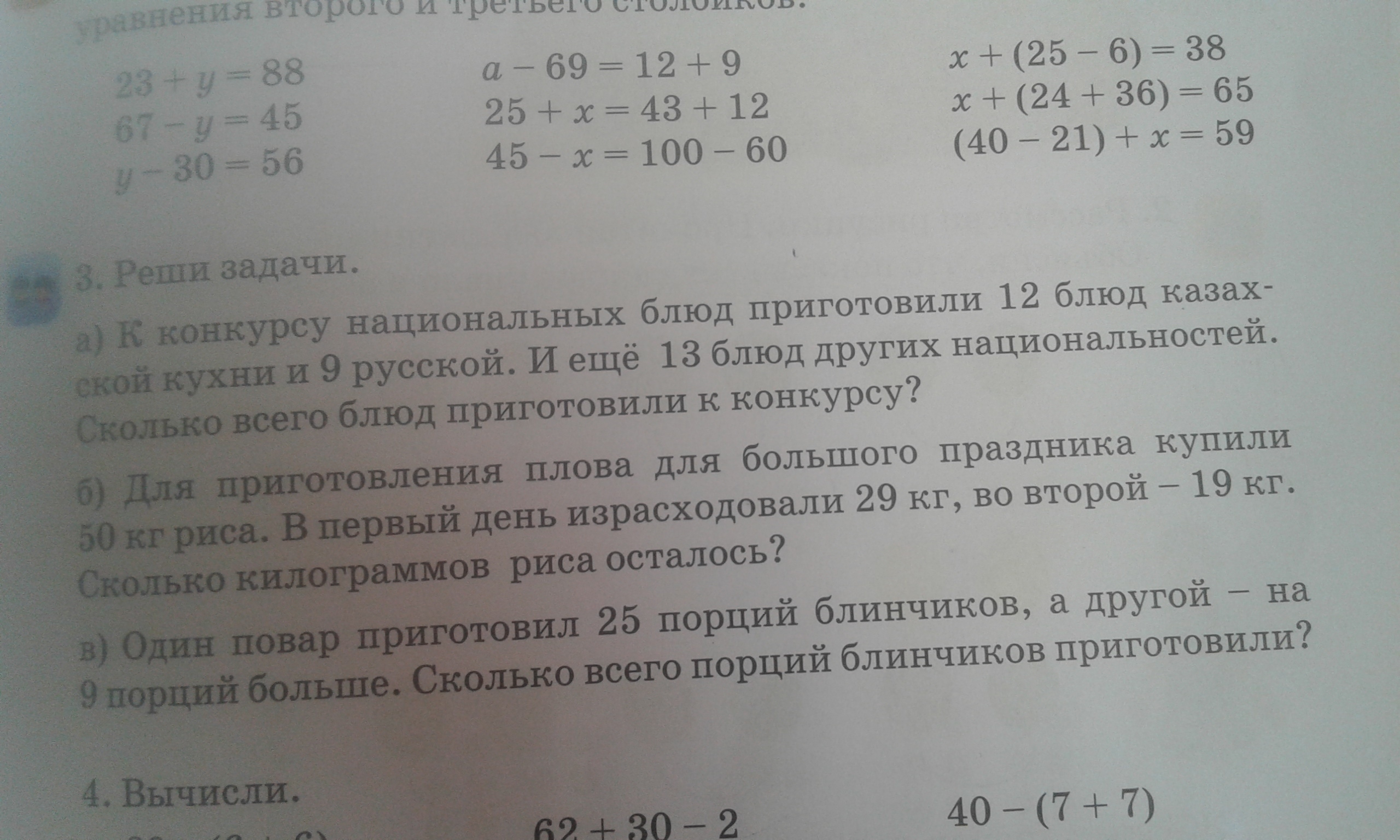 К конкурсу национальных блюд приготовил 12 болюд казахской кухни и 9 русском. И ещё 13 блюд других национальностей. Сколько всего блюд приготовили к конкурсу? б)Для приготовления плова для большого праздника купили 50 кг риса. В первый день израсходовали 29 кг во второй 19 кг. Сколько килограммов риса осталось? в) Один повар приготовил 25 порций билинчиков а другой на 9 порций больше .Сколько всего порций блинчиков приготовили?