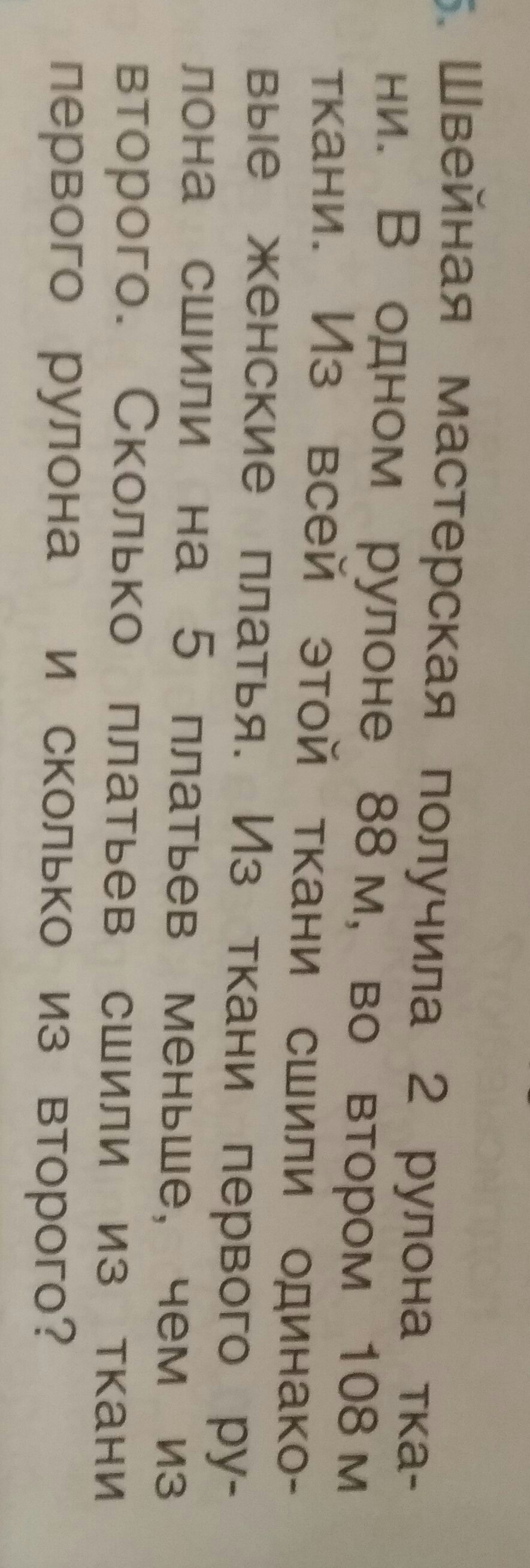 108-88=20 - столько метров ткани потребовалось на 5 платьев