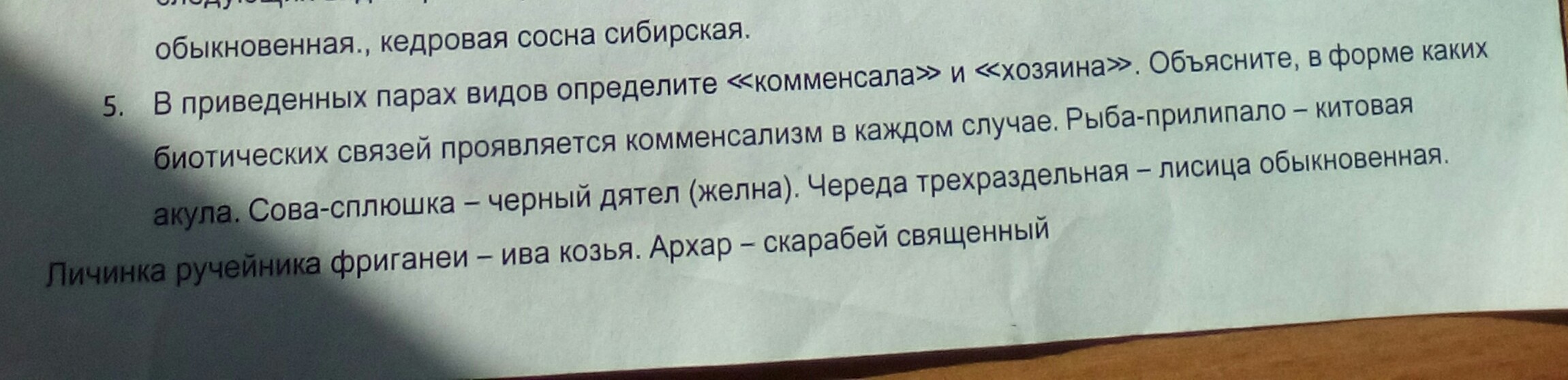 В форме каких биотических связей проявляется комменсализм в каждом случае. Пример: рыба прилипало(комменсал) и китовая акула(хозяин)-форическая связь т.к. рыба доедает остатки пищи после пиршества акулы (можно без типа связи