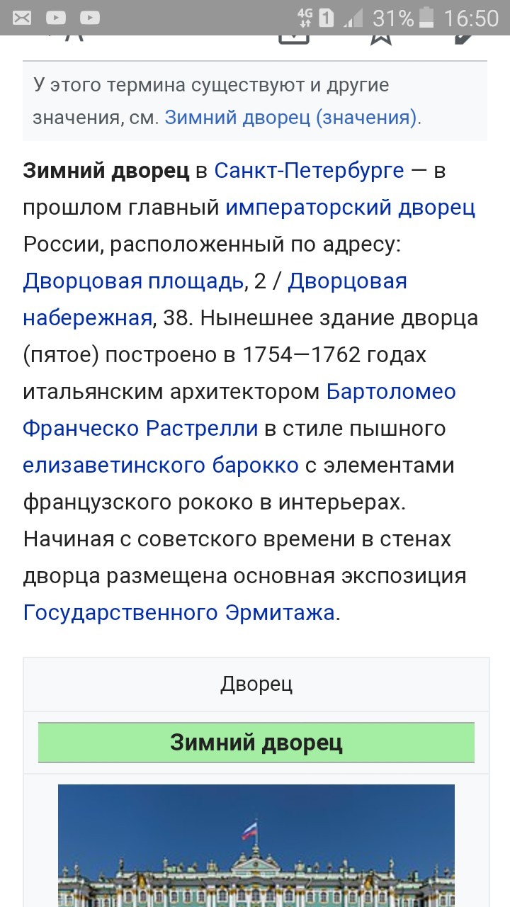 Зимний дворец в прошлом главный императорский дворец России. Было построено в 1754 -1762 годах итальянским архитектором Бартоломео Франческо Растрелли.