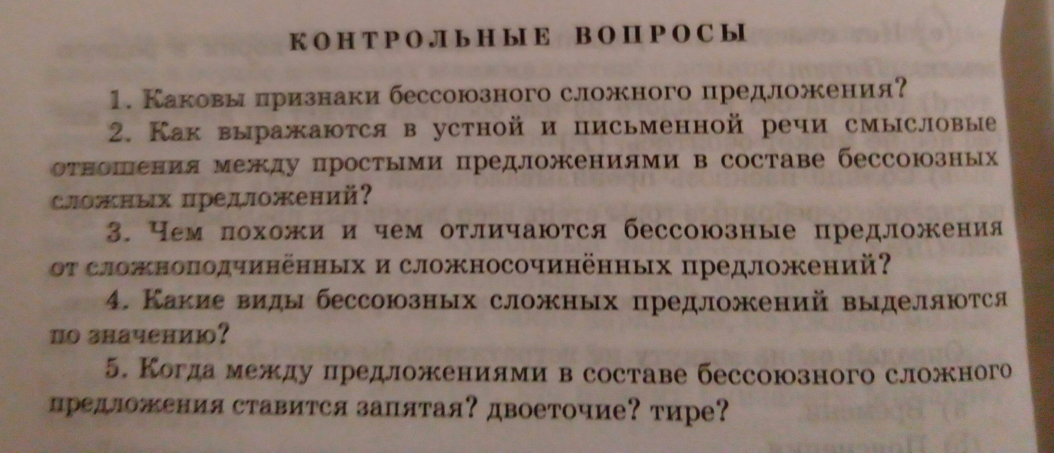 1. Бессоюзное сложное предложение- это сложное предложение, в котором простые предложения объединены в одно целое по смыслу и интонационно, без помощи союзов или союзных слов 2. между простыми предложениями бессоюзного сложного предложения могут быть разные смысловые отношения:перечисление, пояснение, причина. 3. сложноподчиненные предложения- это такие предложения соединены при помощи подчинительных союзов и союзных слови одно предложение 4. изъяснение, дополнение, причина, время, условие, противопоставление, следствие, сравнение, неожиданный результат 5. в зависимости от значения, смысловых отношений между простыми предложениями, бессоюзных сложных предложениях используются следующие знаки препинания : запятая, точка с запятой, двоеточие, тире