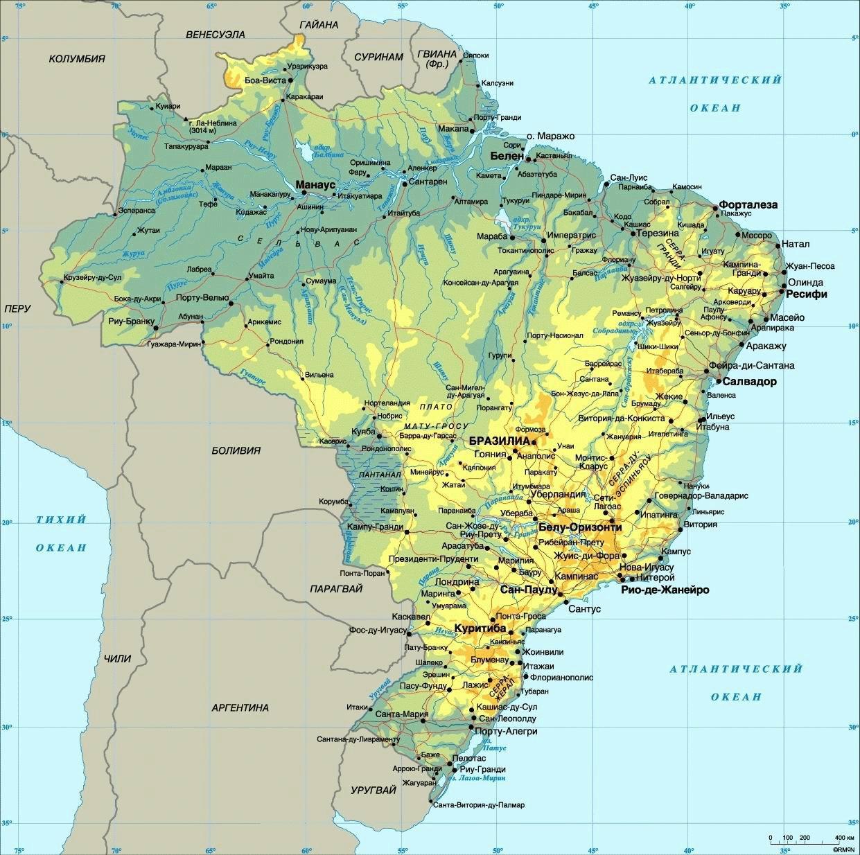 10.Положение относительно крупных форм рельефа.Бразилия расположена южнее Гвианского плоскогорья, западнее Анд и Ла-Платской низменности, восточнее Атлантического океана.