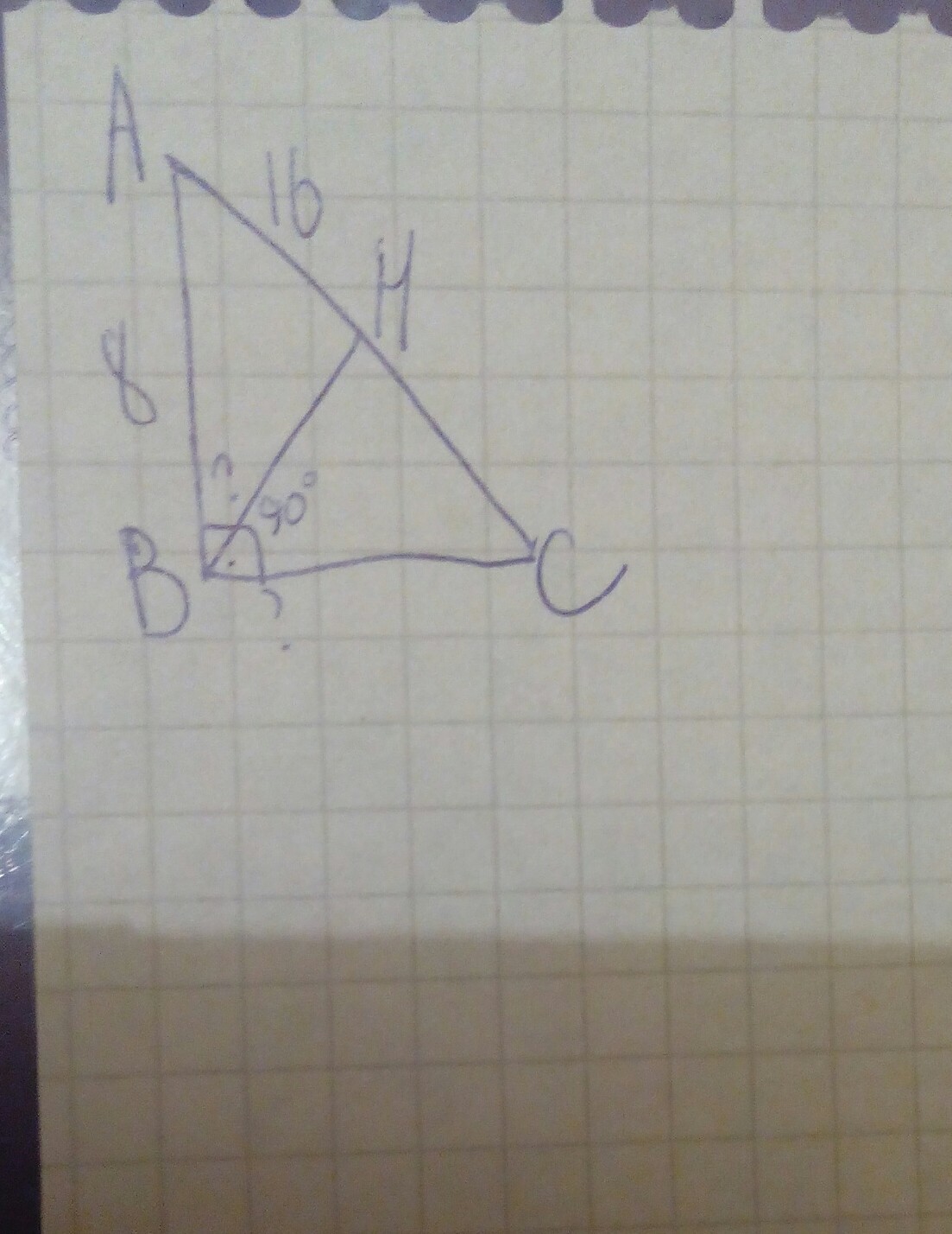 В прямоугольном треугольнике ABC угол B равен 90 градусов, AB равен 8 см, AC равен 16 см. Найдите углы, которые образует высота BH с катетами треугольника