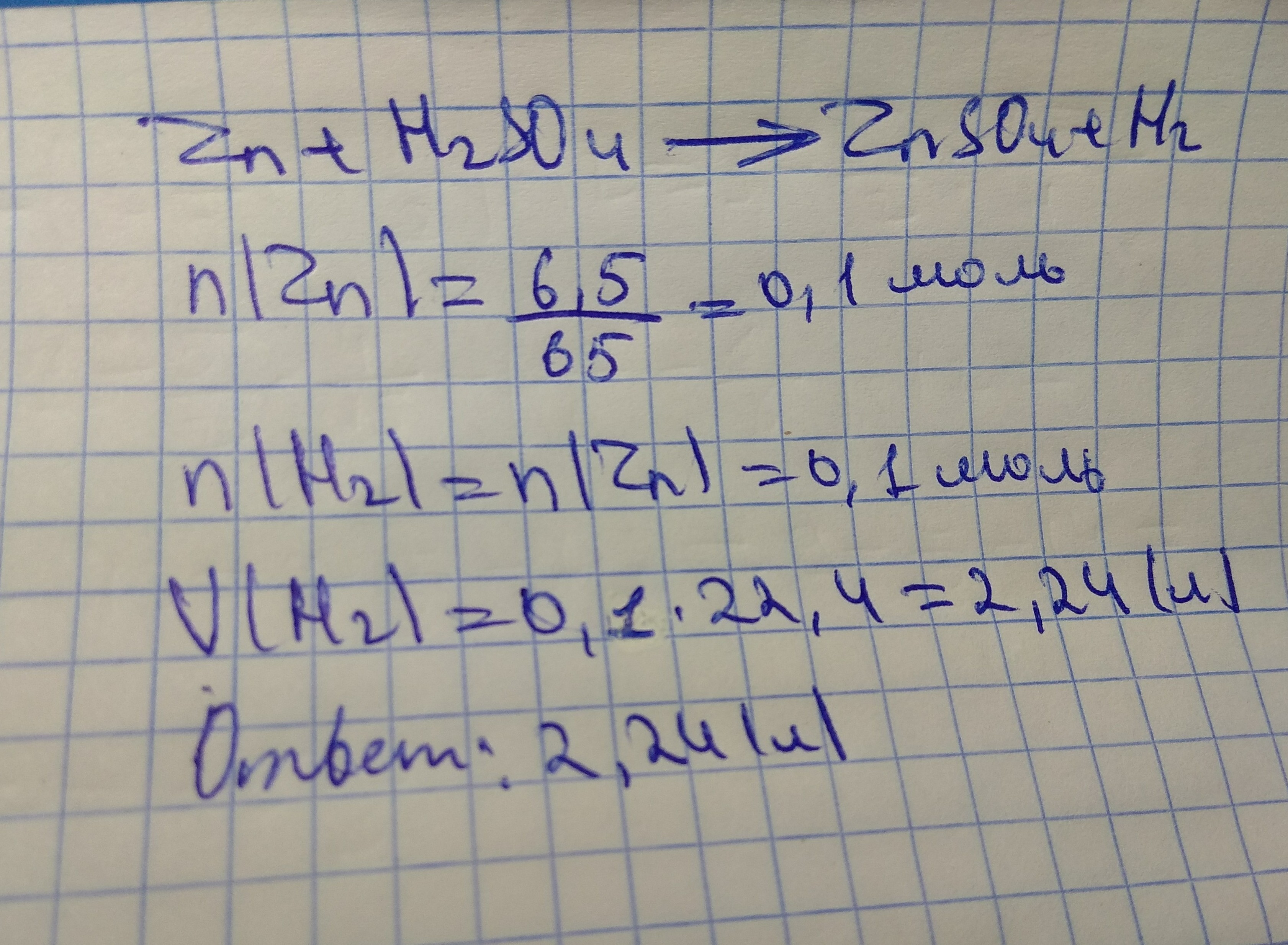 Какой объём водорода выделится при взаимодействии с серной кислотой 6,5 г цинка при нормальных условиях. СРОЧНО!!!