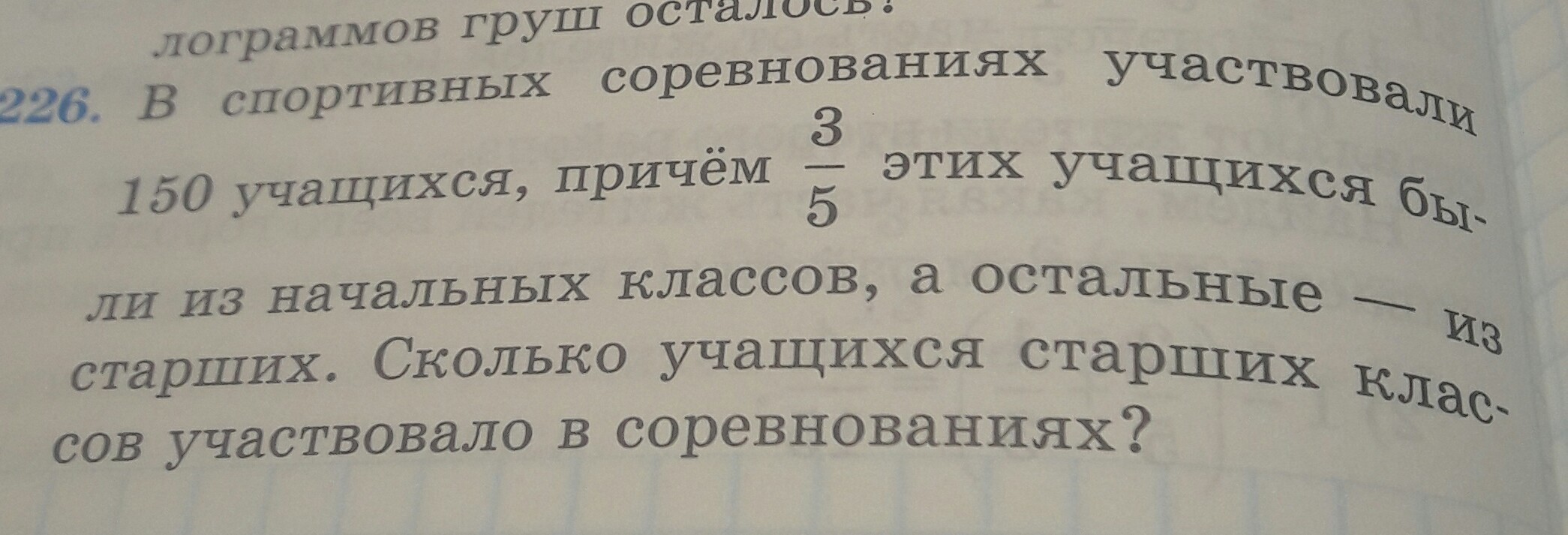 в спортивных соревнованиях участвовали 150 учащихся, причём 3/5 этих учащихся были из начальных классов, а остальные из старших. Сколько учащихся старших классов участвовало в соривнованиях?