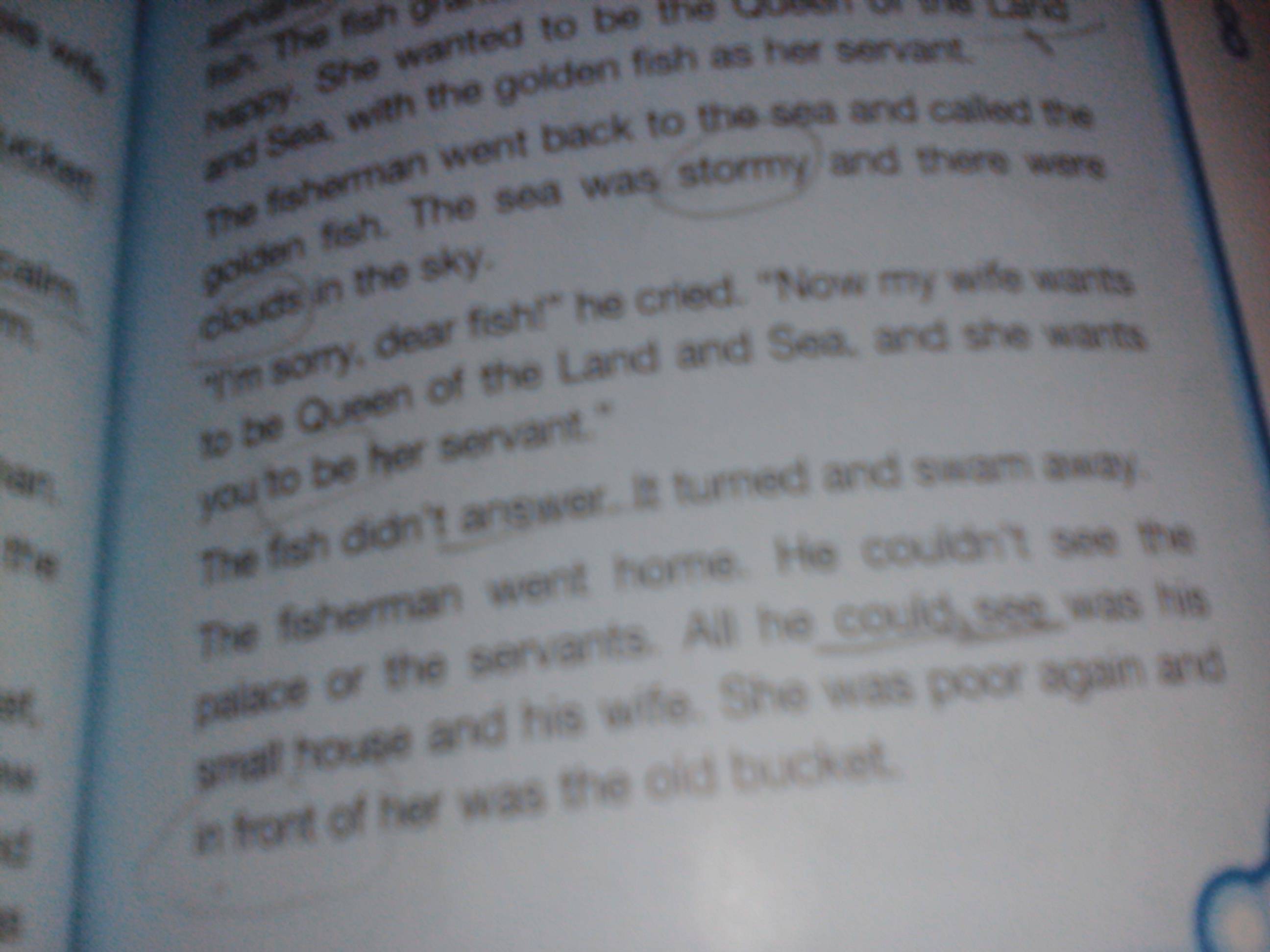 На следующий день муж был отправлен в море, чтобы найти волшебную рыбу и пожелать нового дома. Это желание было, как и до него, предоставлено рыбаку. Но на следующий день рыбака снова отправили обратно, чтобы пожелать, чтобы его жена стала губернатором. На этот раз он вернулся домой, чтобы найти свою жену, одетую в богатство и заказывающую о слугах. Но женщина все еще была недовольна и потребовала стать Королевой всей земли.
