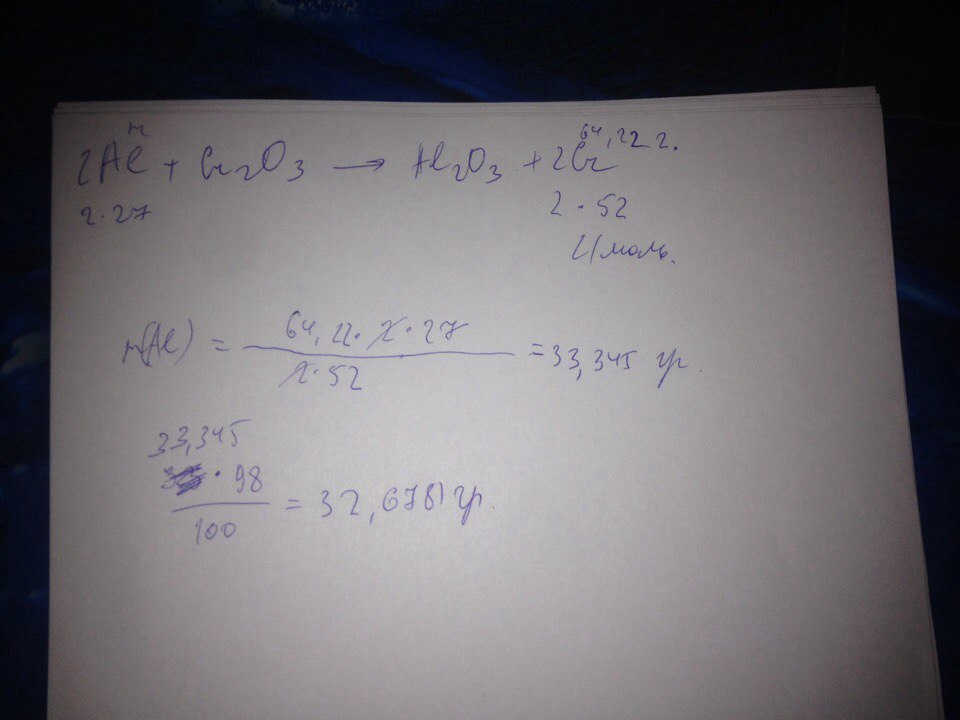Вычислите массу технического алюминия массовая доля 98%,которой потребуется для алюмотермического получения хрома массой 64,22