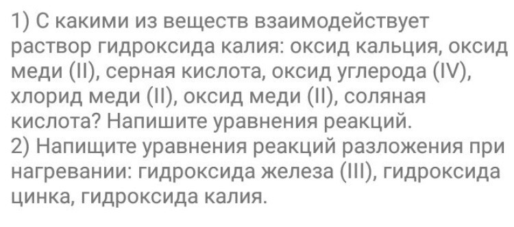a) с какими веществами реагирует раствор гидроксида калия: оксид кальция, оксид меди (II), серная кислота, оксид углерода (IV), хлорид меди (II), оксид меди (II), соляная кислота?