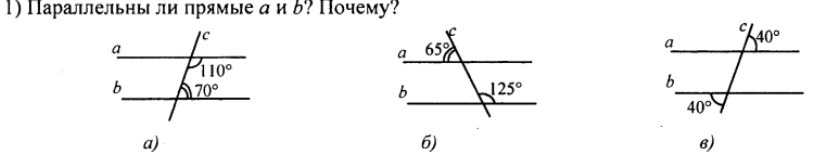 в) дано : прямая а и прямая b пересеченная прямой с , угол 1 равен 40 , угол 2 равен 40 . Решение : угол 1 и угол 4 равны 40 т.к. углы вертикальные , угол 4 и угол 2 соответственные следовательно прямые параллельны .