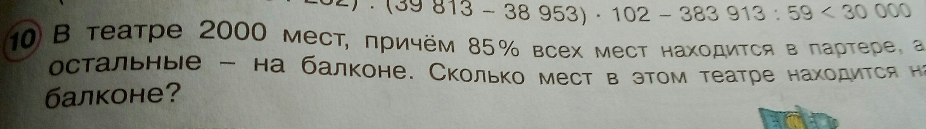 Вычитаем из 100℅ восемьдесят пять ℅. Столько будет мест на балко от общего количества. Умножаем 15 на 2000=30000, убираем 2 нуля- остается 300. 300 мест