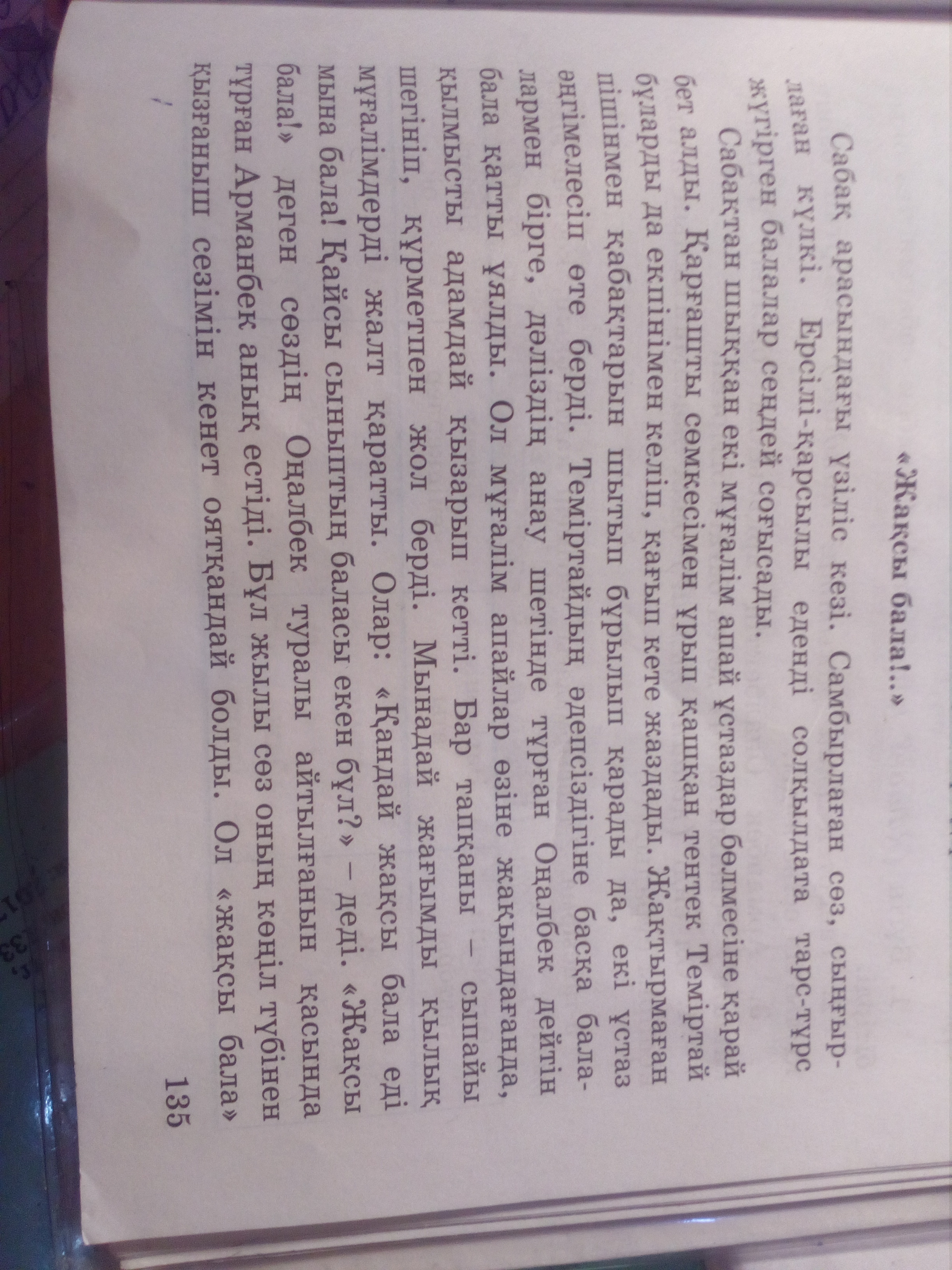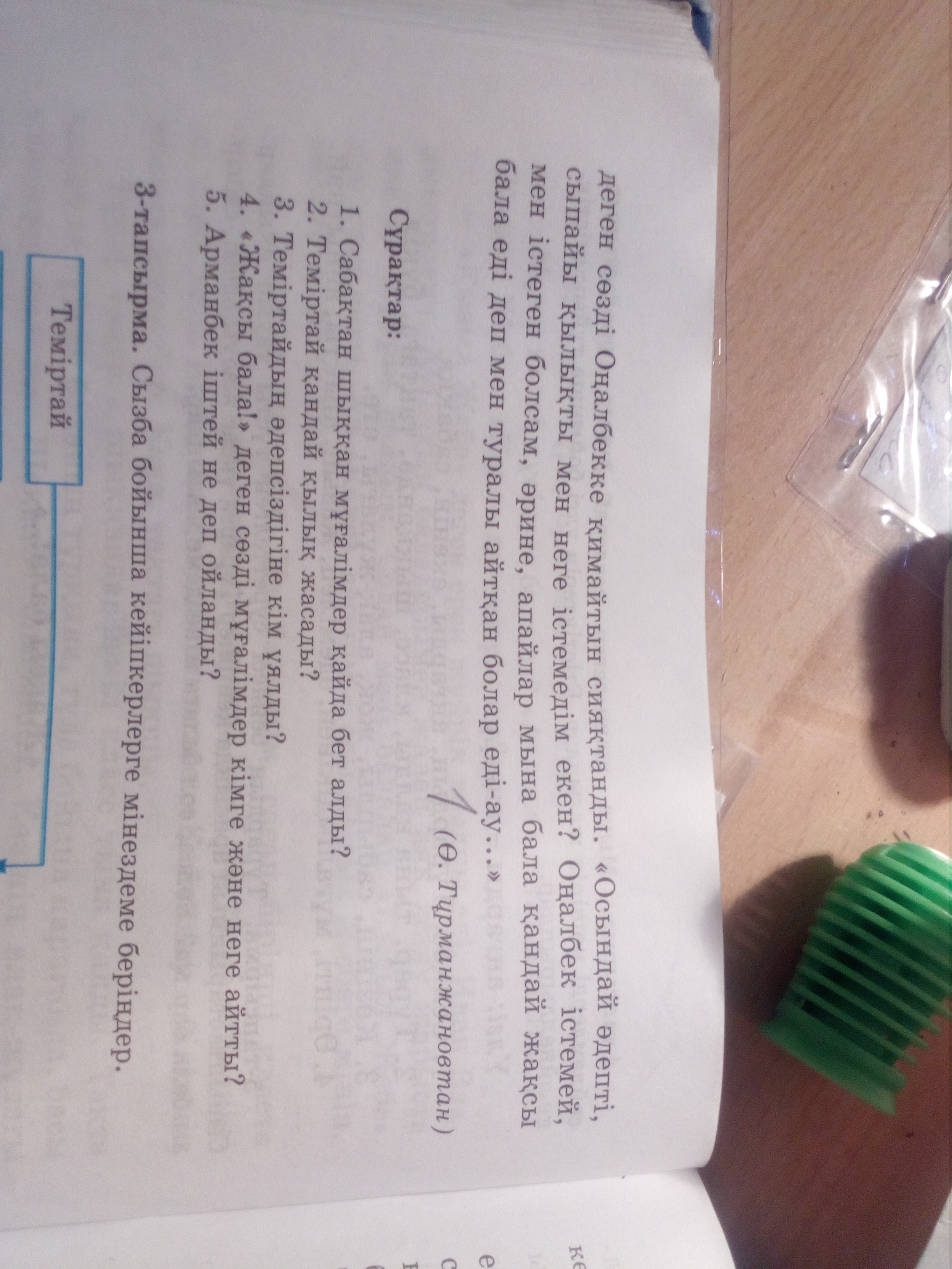 Две учительницы выходят после урока и направляются в учительскую комнату. Непослушный Темиртай чуть не сбил своей тяжелой сумкой учительниц. Учительницы просто посмотрели на него строгим взглядом и пошли дальше разговаривая меж собой. Оналбек и друге ученики стеснялись за своего непослушного одноклассника Темиртая.