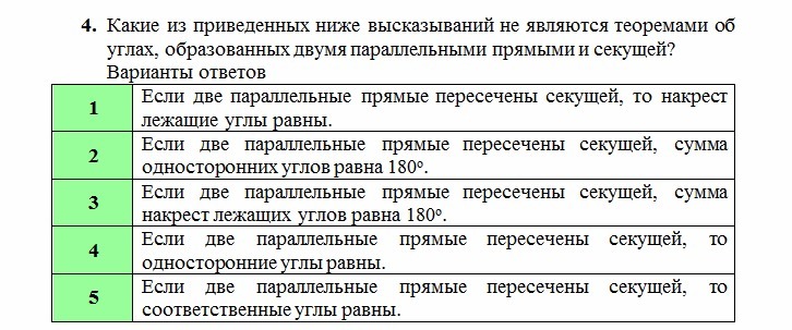 3 и 4 не верно. В 3 потому-что накрест лежащие углы равны. А в 4 потому-что односторонние углы дают 180 градусов