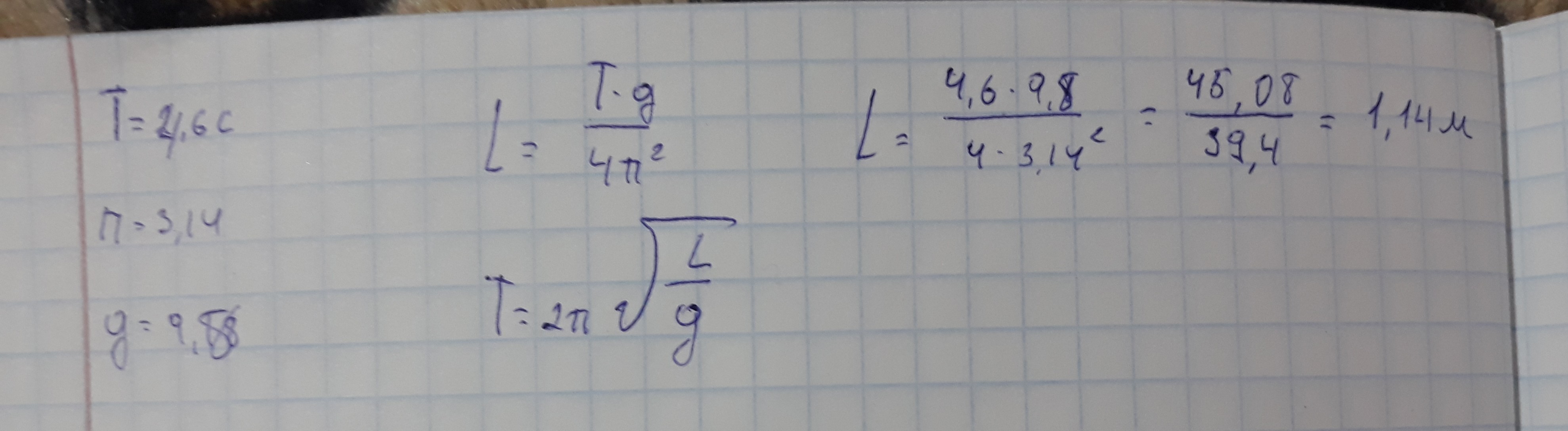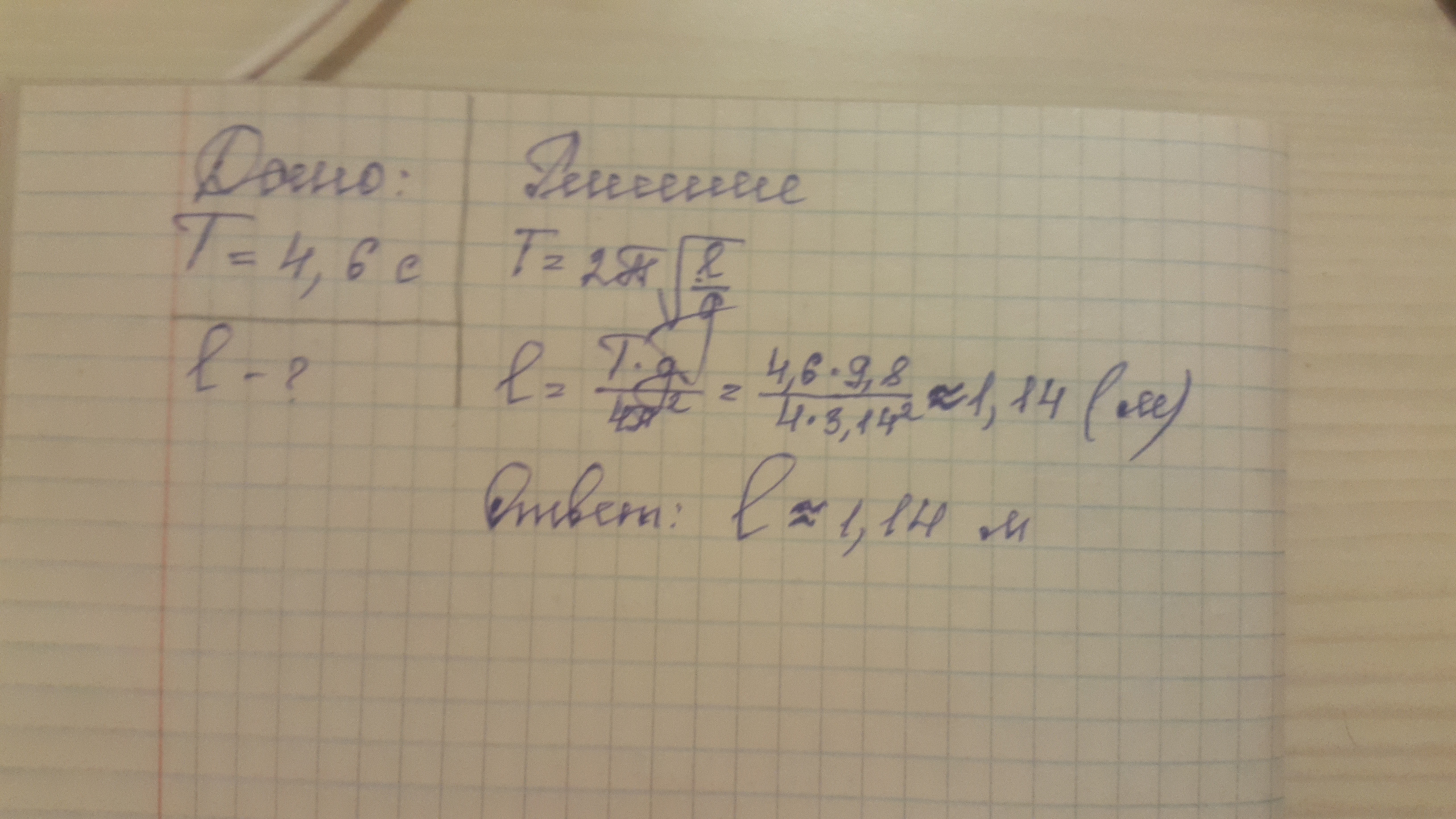 Определи длину математического маятника с периодом колебаний 4,6 с. При расчетах прими π=3,14, g=9,8 м/с².