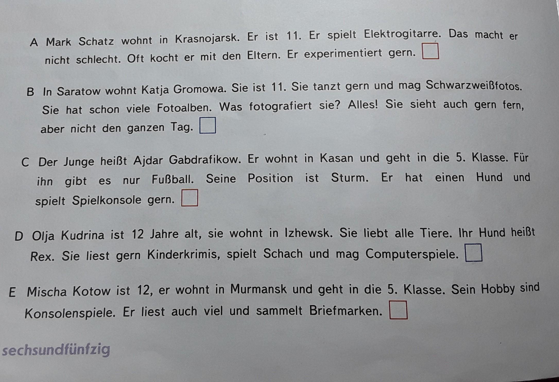 B. В Саратове живёт Катя Громова. Ей 11 лет. Она охотно танцует и любит чёрно-белые фотографии. У неё уже довольно много фотоальбомов. Что она фотографирует? Всё! Также она любит смотреть телевизор,но не весь день.