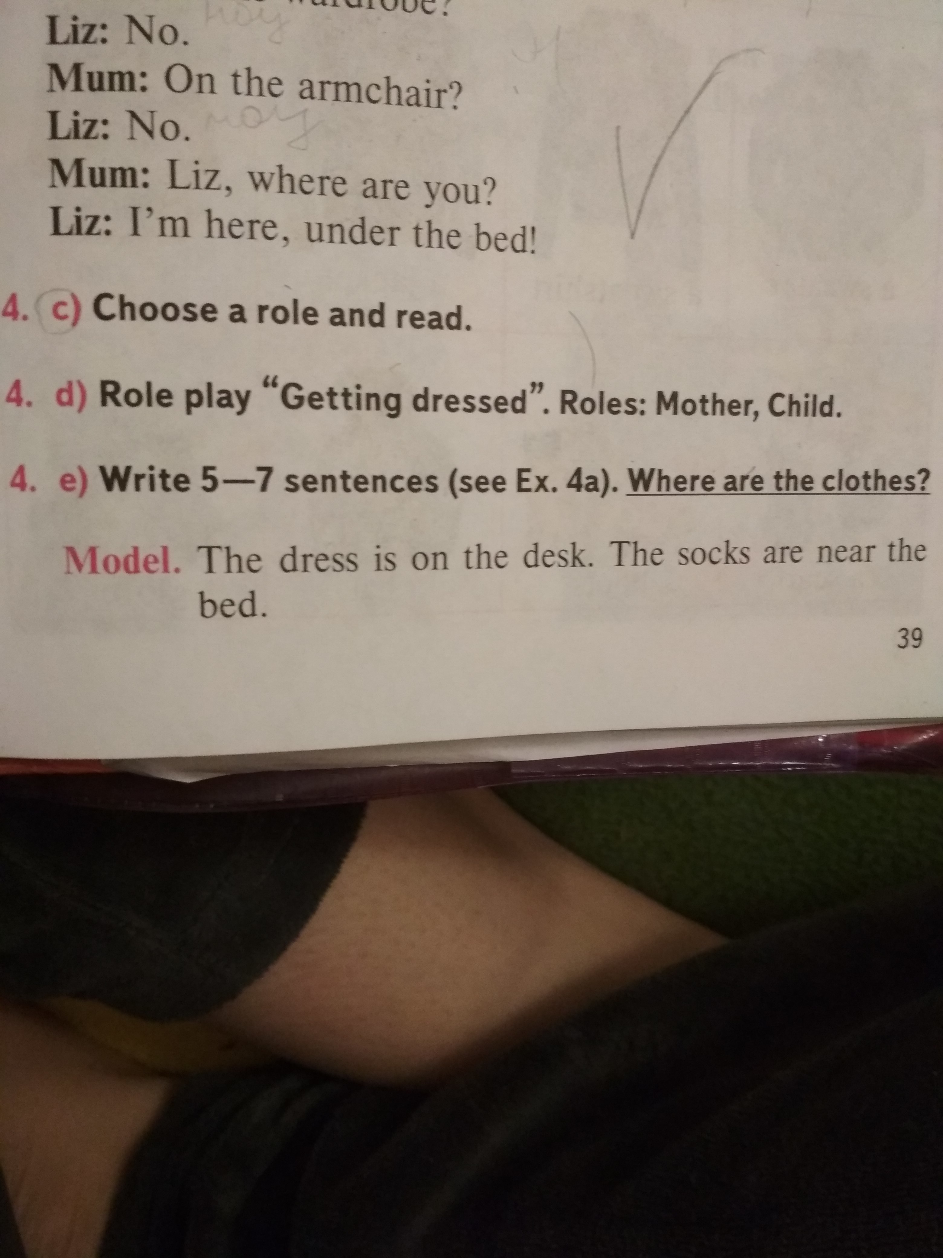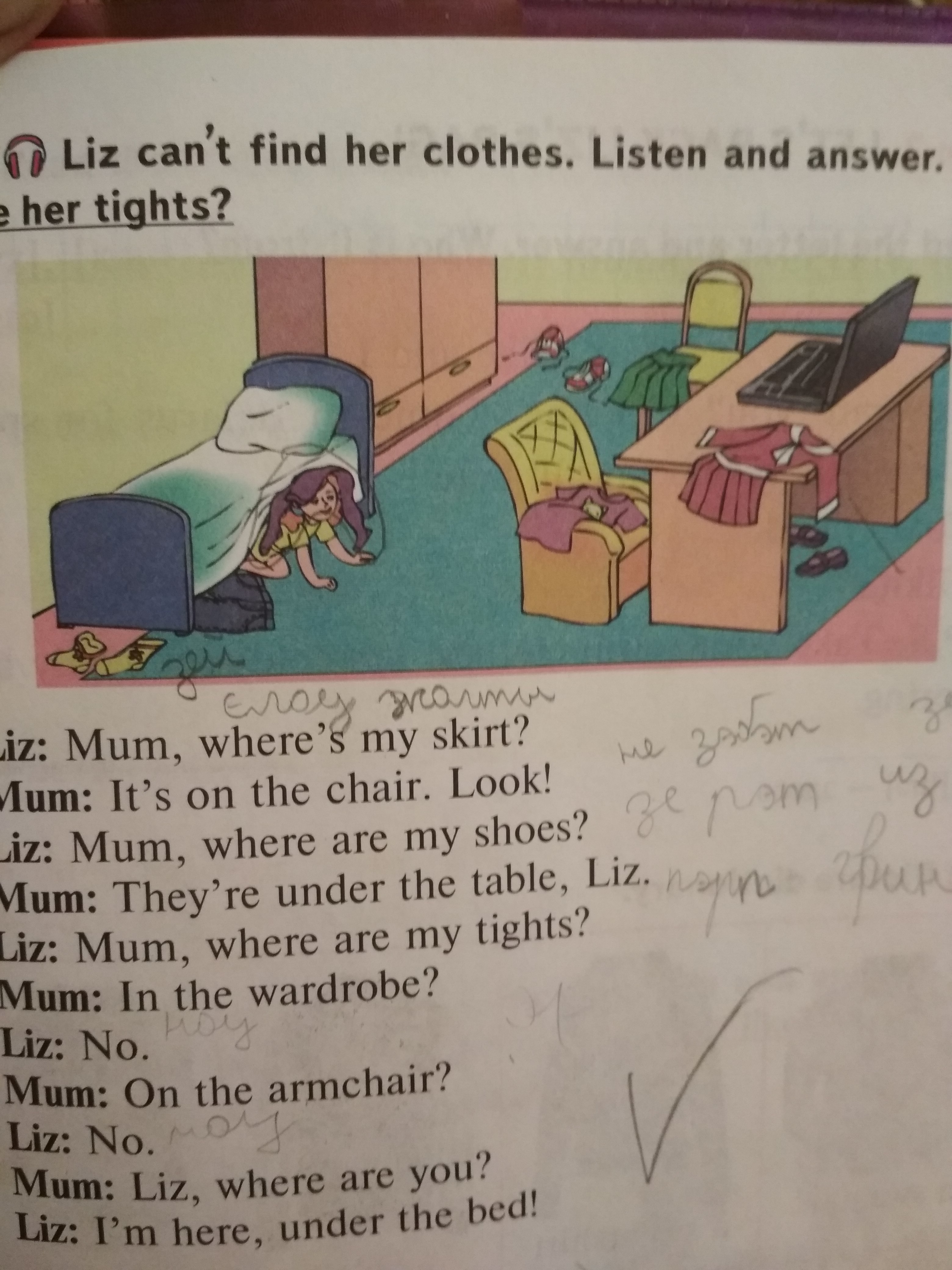 The skirt is in my cupboard. The accessories are on my chair. The boots are under the table. The blouse is near the armchair. The sweater is hand in the wardrobe.