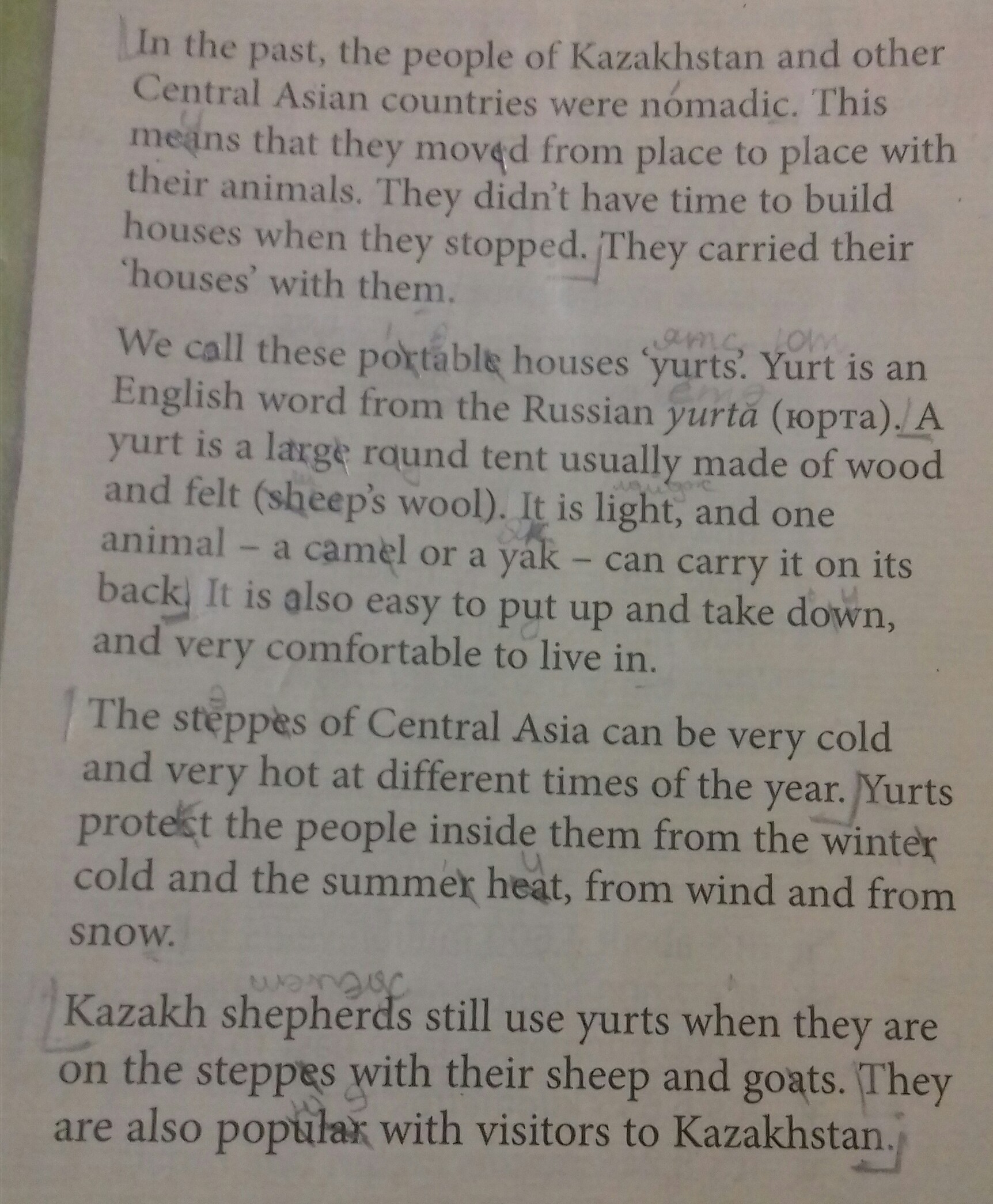 Мы называем эти переносимые дома юртами . Юрта( yurt) это английское слово от русского юрта (yurta) . Юрта это большая, круглая палатка, сделанная из дерева и войлока (овечья шерсть) он легкий и некоторые животное - верблюд или як могут нести его на их спине.его также легко строить и складывать и очень удобно жить в нем .