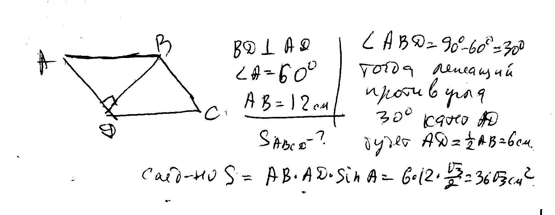 Диагональ ВД параллелограмма АВСД перпендикулярна к стороне АД, АВ= 12 см, угол А=60'С. Найдите площадь параллелограмма?