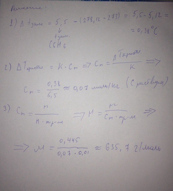 Гормон щитовидной железы – тироксин массой 0,445 г растворили в бензоле массой 10 г. Температура кристаллизации полученного раствора составила 278,12 К. Рассчитайте молярную массу тироксина.