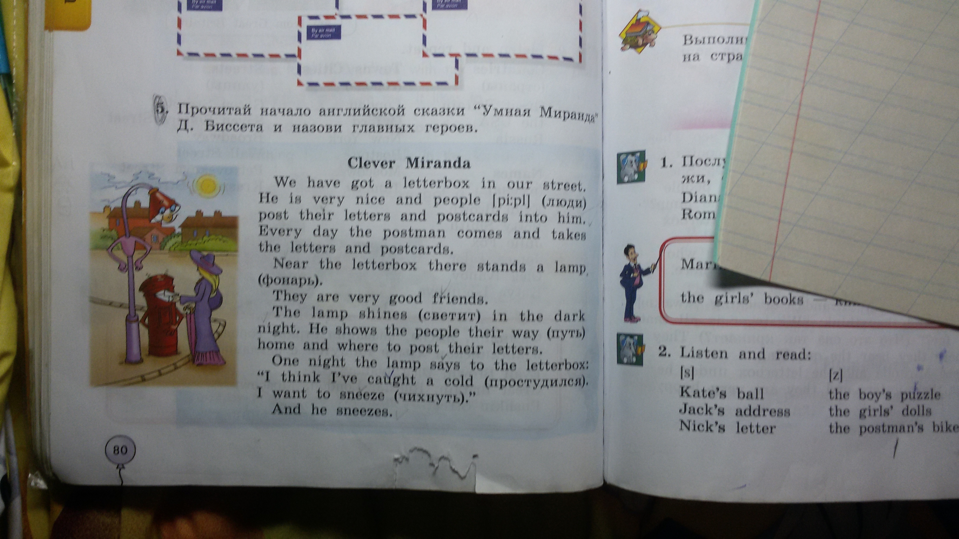 У нас есть почтовый ящик на нашей улице. Он очень милый и люди опускают свои письма и открытки в него. Каждый день почтальон приходит и забирает письма и открытки . Рядом с почтовым ящиком там стоит фонарь . Они хорошие друзья . Фонарь светит в темноте ночью . Он освещает людям путь домой и показывает куда закидывать их письма . Однажды ночью фонарь говорит почтовому ящику :" Я думаю , я простудился . Я хочу чихнуть "! И он чихает .