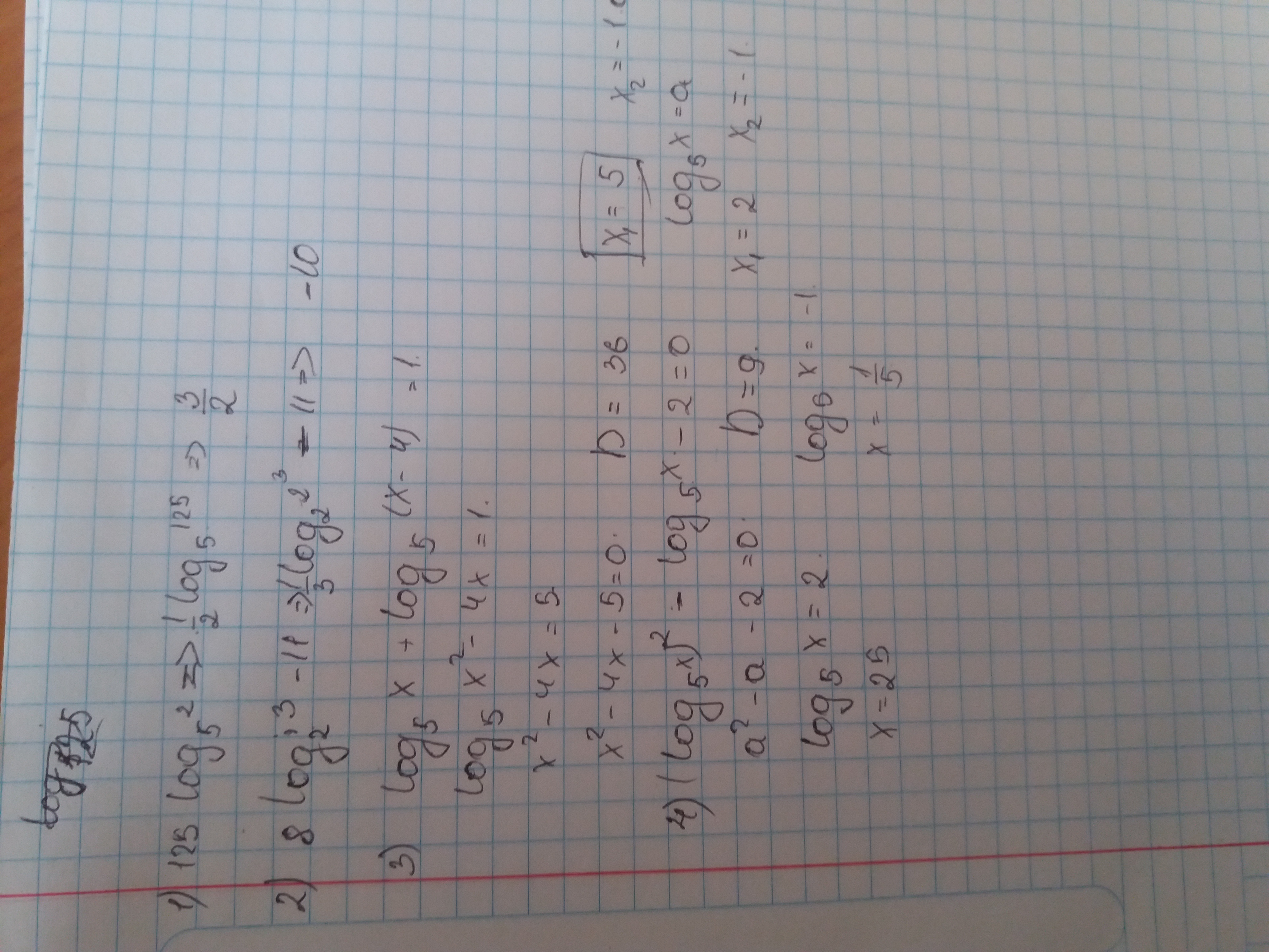125 log5^2=? ; 8 log2^3 -11=? ;