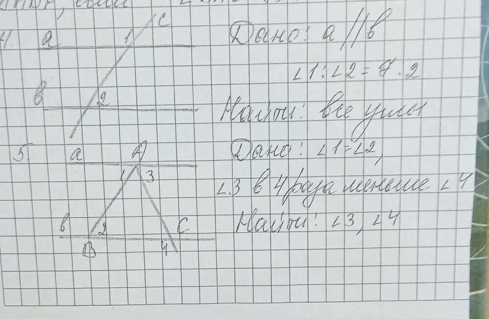 4. Угол 1+2 равны 180 градусов. Следовательно угол 1+2 равны 7+2=9 из этого следует, что 180 градусов равно 9 частям, найдем 1 часть, 180:9=20, теперь найдем угол 1 и 2, угол 1= 20*7=140, угол 2=20*2=40 градусов.