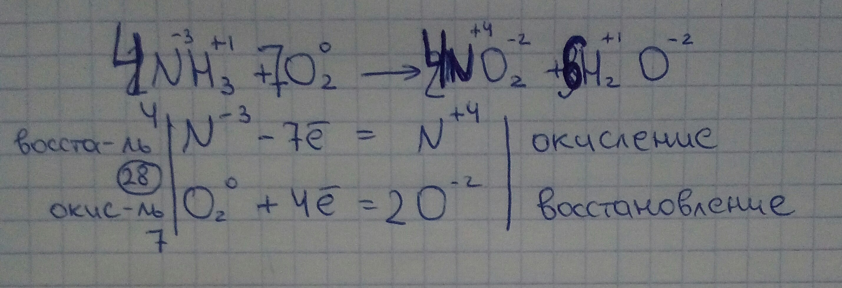 Определите коэффициенты в следующей схеме химической реакции, используя метод электоронного баланса: NH3 + O2 --- NO+ H2O.