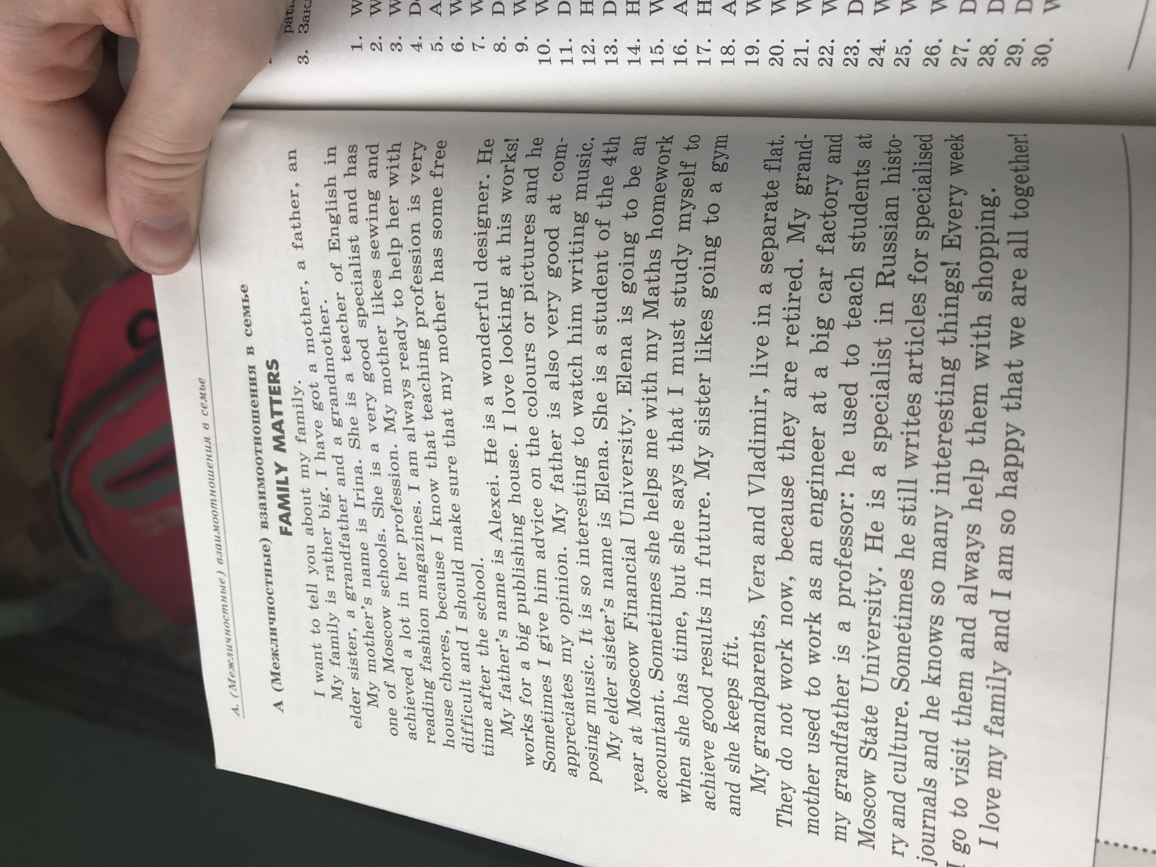 A (Я хочу рассказать вое моей семье, скорее, о моей семье, а у меня есть мать, а у нее старшая а она учительница и имеет имя моей матери Ирина. Хорошая спецификация Она - школа. Мать любит Инг и добился Jet в профессии, помог ей с готовностью читать faNhion, что trac: профессия hing - очень домашняя хорея. becamae знает, что у моей матери есть бесплатные tine tut, и r должен убедиться, что чат замечательный дизайнер. Он возглавляет школу Alex He My father Я люблю смотреть на его работы! Работает крупным изданием colo ra или картин, и я даю ему совет, который ценит мое мнение. Мой отец тоже очень хорош в музыке. Мне так интересно смотреть на него 4-ая Имя моей старшей сестры - Елена. Она - студенческий год в Московском финансовом университете, Елена будет увитантом. Иногда она помогает мне с моей домашней работой в Мин, но она должна учиться, чтобы добиться хороших результатов в будущем. сестре нравится ходить, и она держится. Мои дедушки и бабушки, Вера и Вла dimir, живут в отдельной квартире. Они не работают сейчас, потому что они ушли на пенсию. Моя мать работала инженером на большой машине, и я был профессором: фабрикой и Московским государством, которым он преподавал студенческий университет. Он специалист по истории и культуре России. Иногда он все еще пишет статьи для специализированных журналов, и он знает так много интересного! Каждую неделю отправляйтесь навестить их и всегда помогать им с покупками. Я люблю свою семью, и я так счастлив, что мы все вместе
