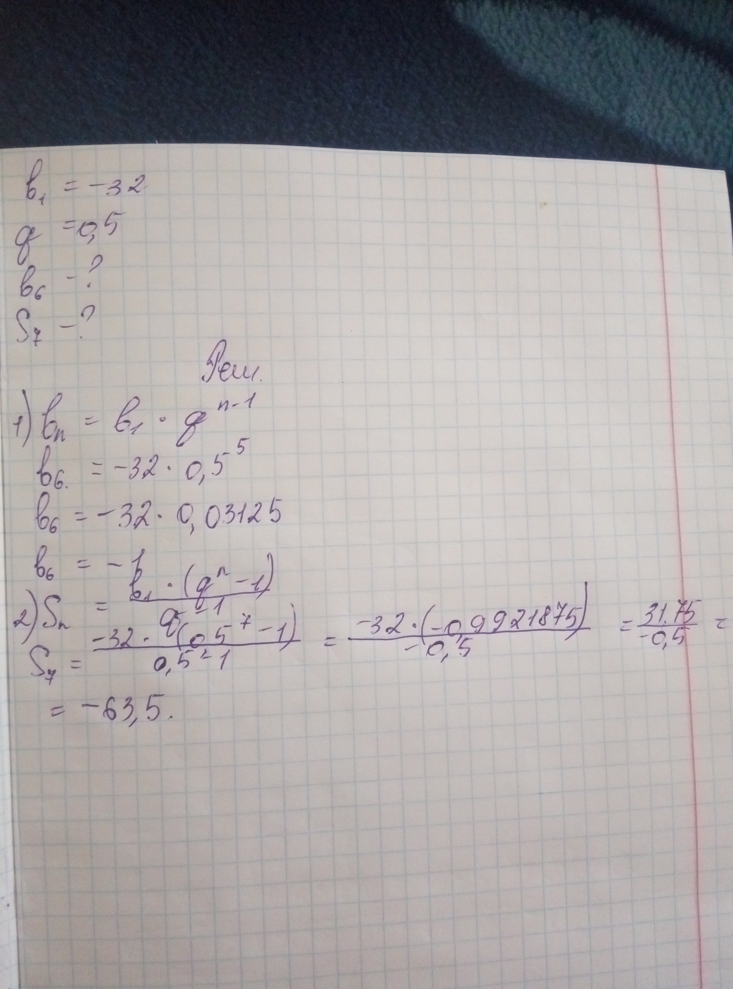 дана геометрическая прогрессия первый член которой равен -32 а знаменатель равен 0,5 а)найдите ее шестой член б)найдите сумму 7 членоа