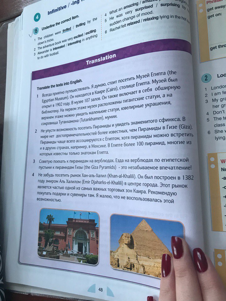 1. Всегда приятно путешествовать. Я думаю, стоит посетить Музей Египта (the Egyptian Museum). Он находится в Каире (Cairo), столице Египта. Музей был открыт в 1902 году. В музее 107 залов. Он также включает в себя обширную библиотеку. На первом этаже музея расположены гигантские статуи, а на верхнем этаже можно увидеть маленькие статуи, ювелирные украшения, сокровища Тутанхамона (Tutankhamen), мумии.