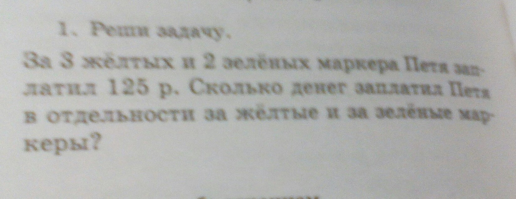 за 3 желтых и 2 зеленых маркера Петя заплатил 125 руб. Сколько денег заплатил Петя в отдельности за жёлтые и зелёные маркеры