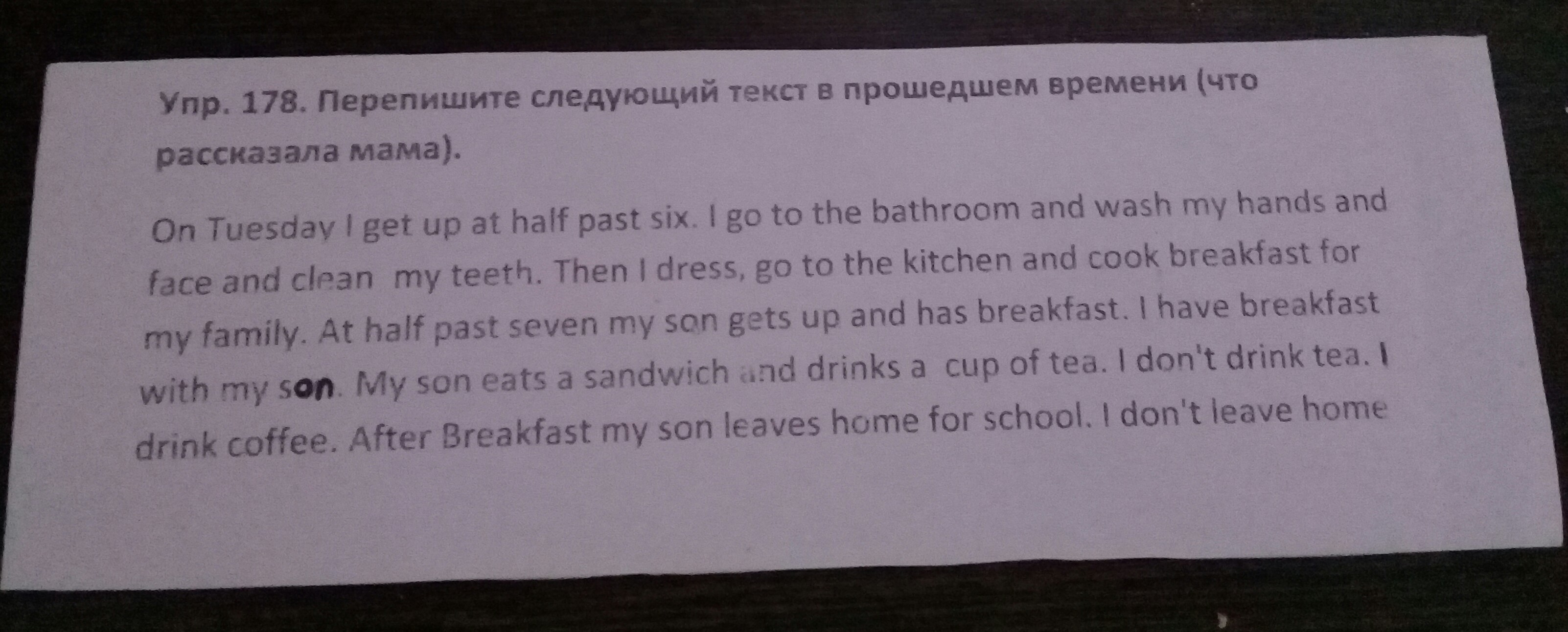 Got up, went, washed, cleaned, dressed, went, cooked, got up, had, had, ate, drank, didn't, drank, leaved, didn't.