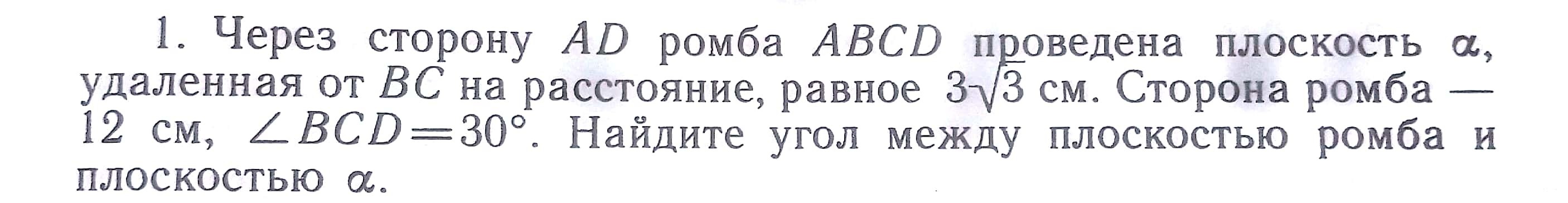 Через сторону AD ромба ABCD проведена плоскость альфа, удаленная от BC на расстояние равное 3 корней из 3 см. Найдите угол между плоскостью ромба и плоскостью альфа.