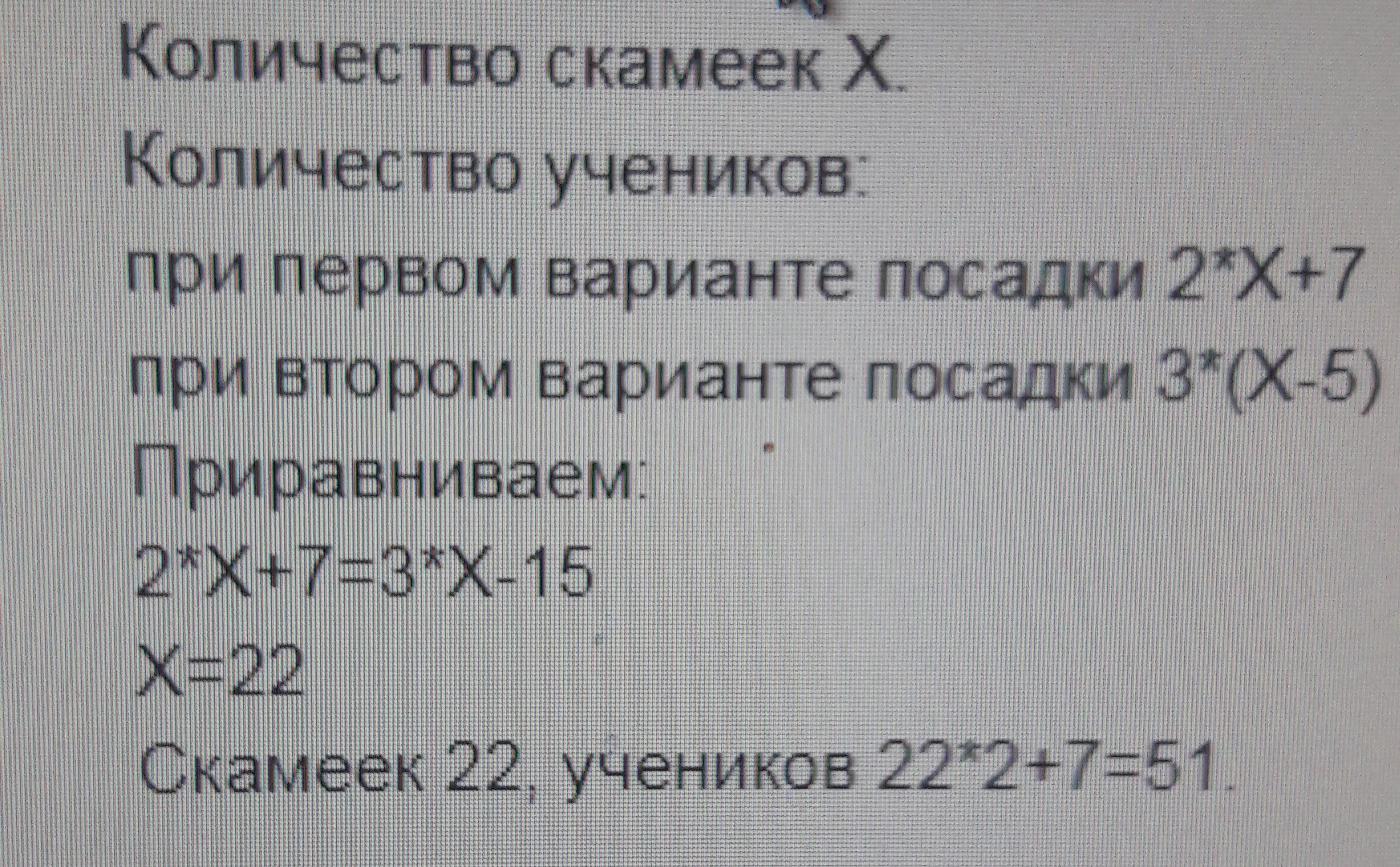 В зале стоит несколько скамеек. Если на каждую скамейку сядут 2 ученика, то 7 учеников останутся без места. Если же на каждую скамейку сядут 3 ученика, то 5 скамеек останутся свободными. Узнай число учеников и кол-во скамеек в зале