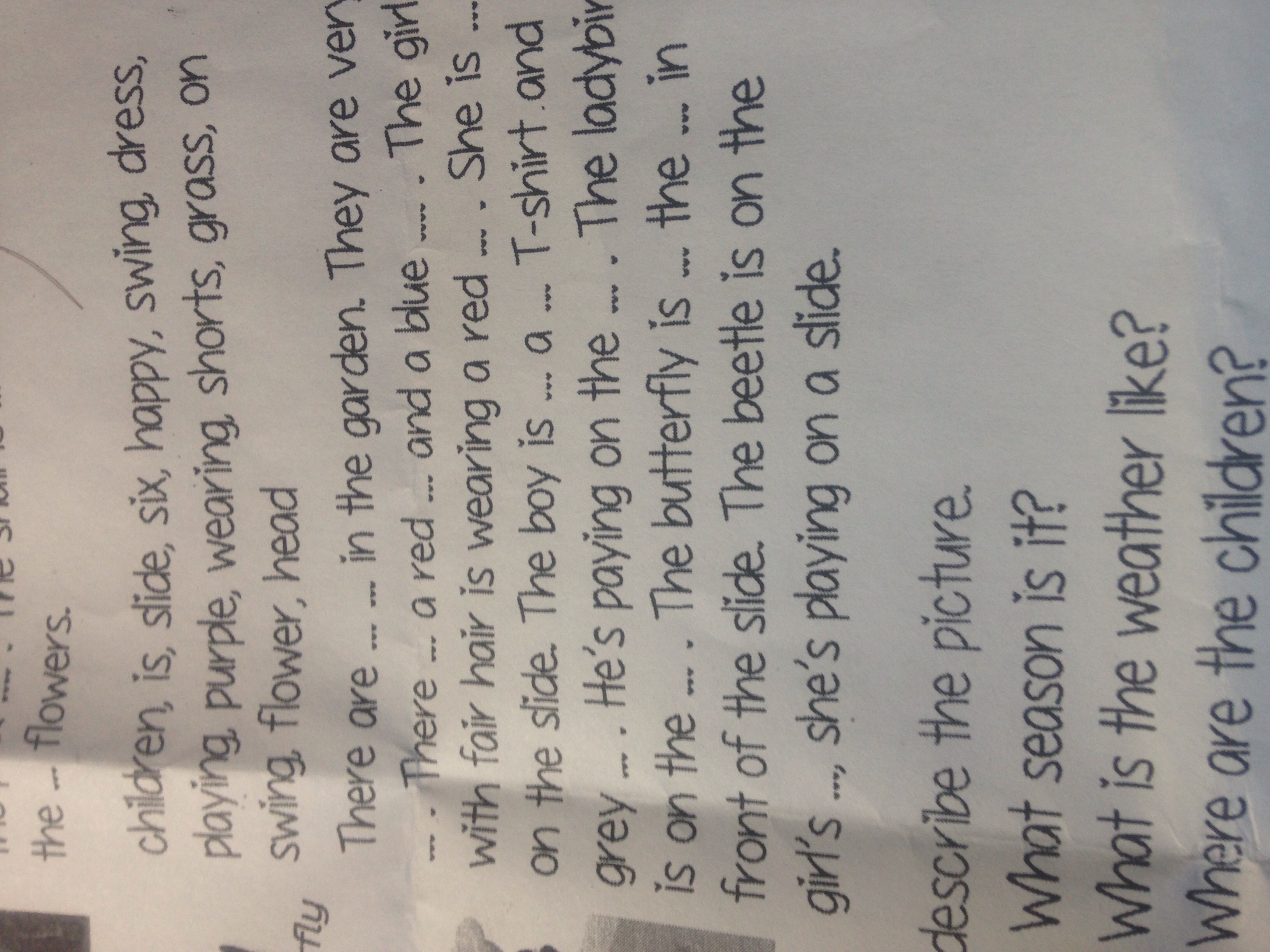 There are children in the garden. They are very happy. The girl with fair hair is wearing a red dress. She is playing on the side. The boy is wearing a purple T-shirt and grey shorts. He's playing on the grass. The ladybird is on the flower. The butterfly is swinging the swings in front of the side The beetle is on the girl's head, she is playing on the slide.