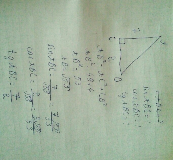треугольник абс угол с 90 ас=7 бс=2 найти синус косинус и тангенс угла абс