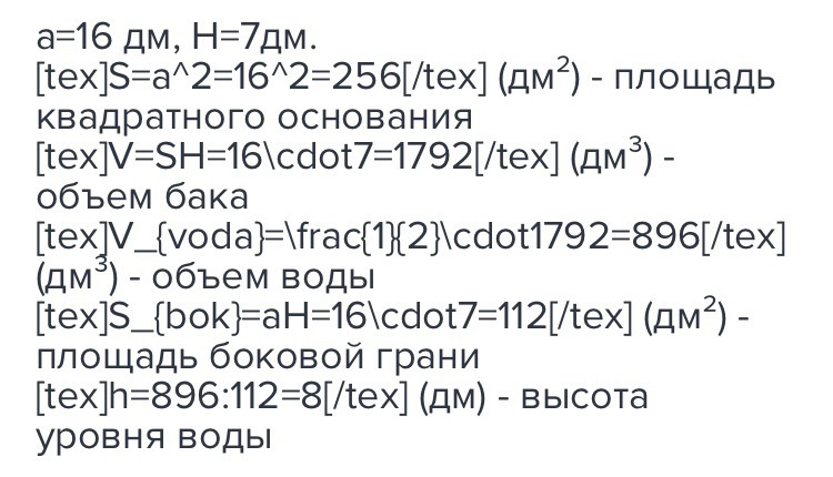 В основании лежит квадрат со стороной 8 дм, а высота бака 9 — дм.
