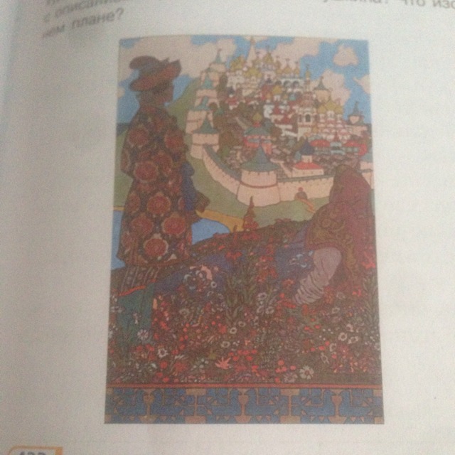 Иван Билибин любил Русь былинную, сказочную, древнюю..Он отражал в своих иллюстрациях необычную красоту Родины. В центре картины " Гвидон и царица "( это иллюстрация к " Сказке о царе Салтане " ) - молодой князь. Около - матушка. С холма, покрытого роскошными цветами, они обозревают жизнь чудного города.День яркий, летний. Изнеженные травы теплы.Золотые купола церкви сияют. Город окружает мощная стена с башнями.Я уверена, что жители этого города всегда будут защищены от врагов, которые посмеют нарушить их покой. Прекрасны образы главных героев нашей картины. Царица возлежит на блестящей траве среди скромных цветов. Голову ее покрывает платок, весь в узорах. Платье - синее. Она - олицетворение мира и тишины. Гвидон стоит и внимательно следит за городом. Лиц героев зритель не видит. Но их позы " говорят" о том, что они поглощены мыслью о будущем вверенной им страны. Кафтан с орнаментом и кушак на Гвидоне - синий , как небушко. Бибибин помещает и Гвидона, и царицу - в тень, а солнышко освещает выдуманный город с церквями. Церковь по традиции считается символом Руси, местом, где живет душа. Автор картины, русский человек, показывает свою любовь к Родине, гармонично соединяя свое представление о жизни с пушкинской " Сказкой о царе Салтане".