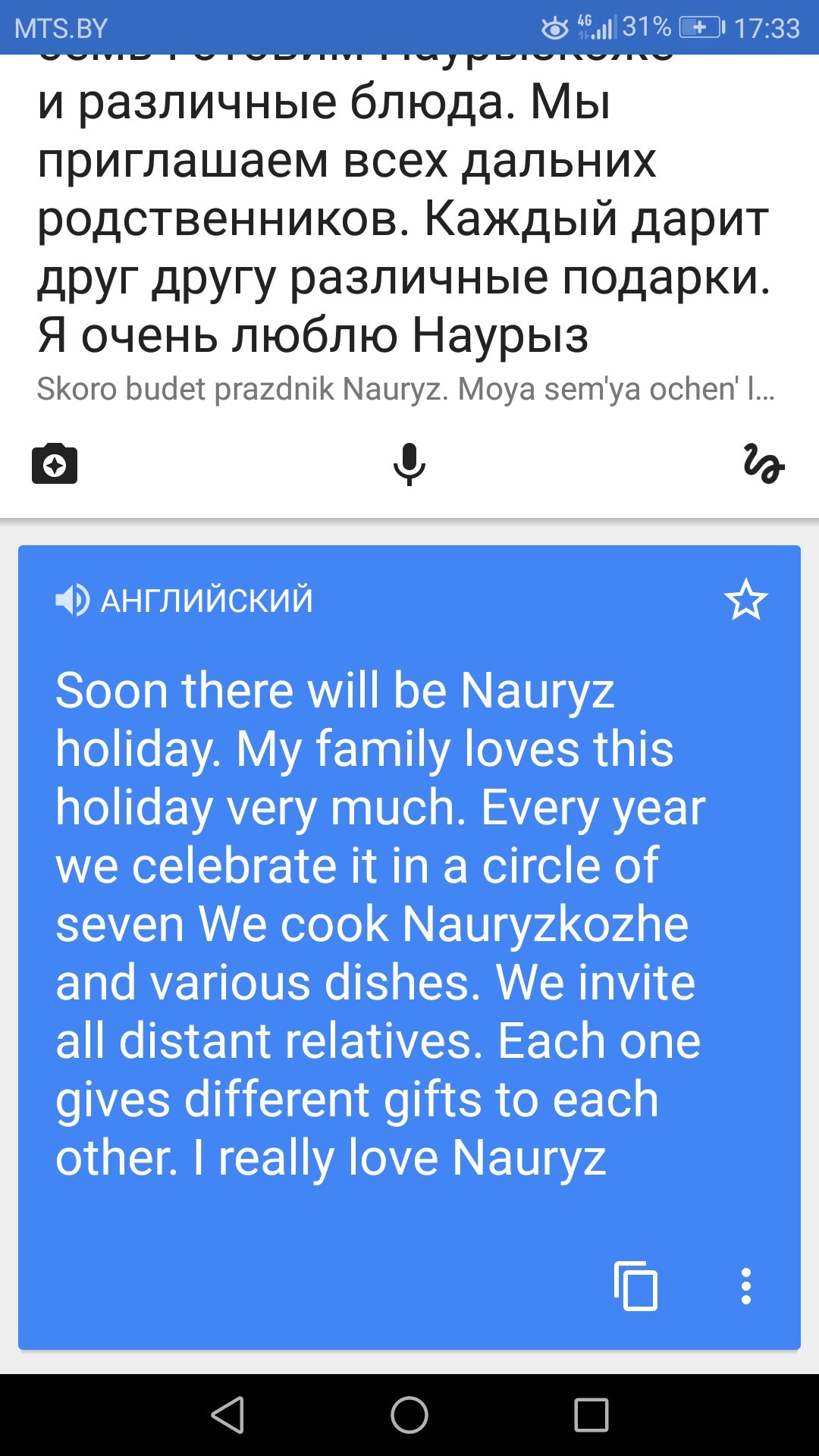 Скоро будет праздник Наурыз. Моя семья очень любит этот праздник. Каждый год мы празднуем его в кругу семьи. Готовим Наурызкоже и различные блюда. Мы приглашаем всех дальних родственников. Каждый дарит друг другу различные подарки. Я очень люблю Наурыз
