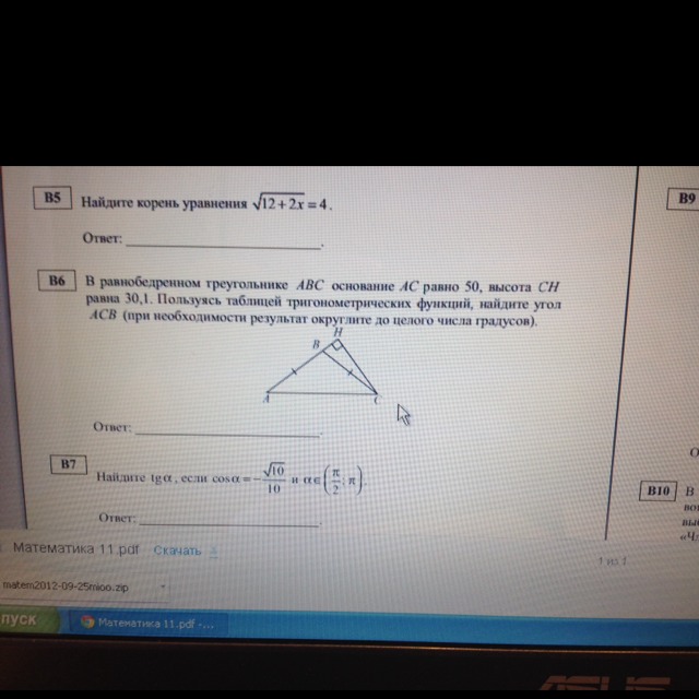Помогите В6 в равнобедренном треугольнике АВС основание АС равно 50, высота СН 30,1, найти угол АСВ