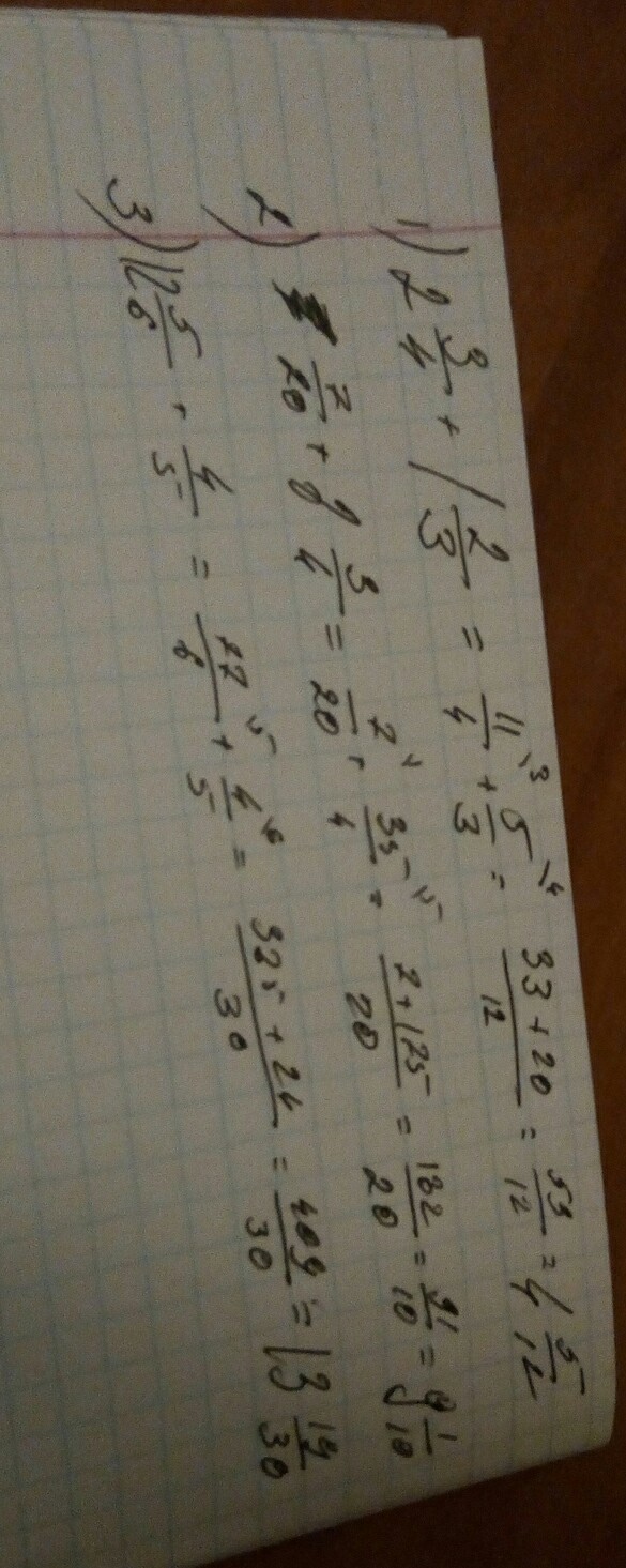 1)3/2+2/3=13/6=2 1/6; 2)7/20+6=127/20=6 7/20; 3)10×5+4/5=10+4/5=54/5=10 4/5. Это точно правильно