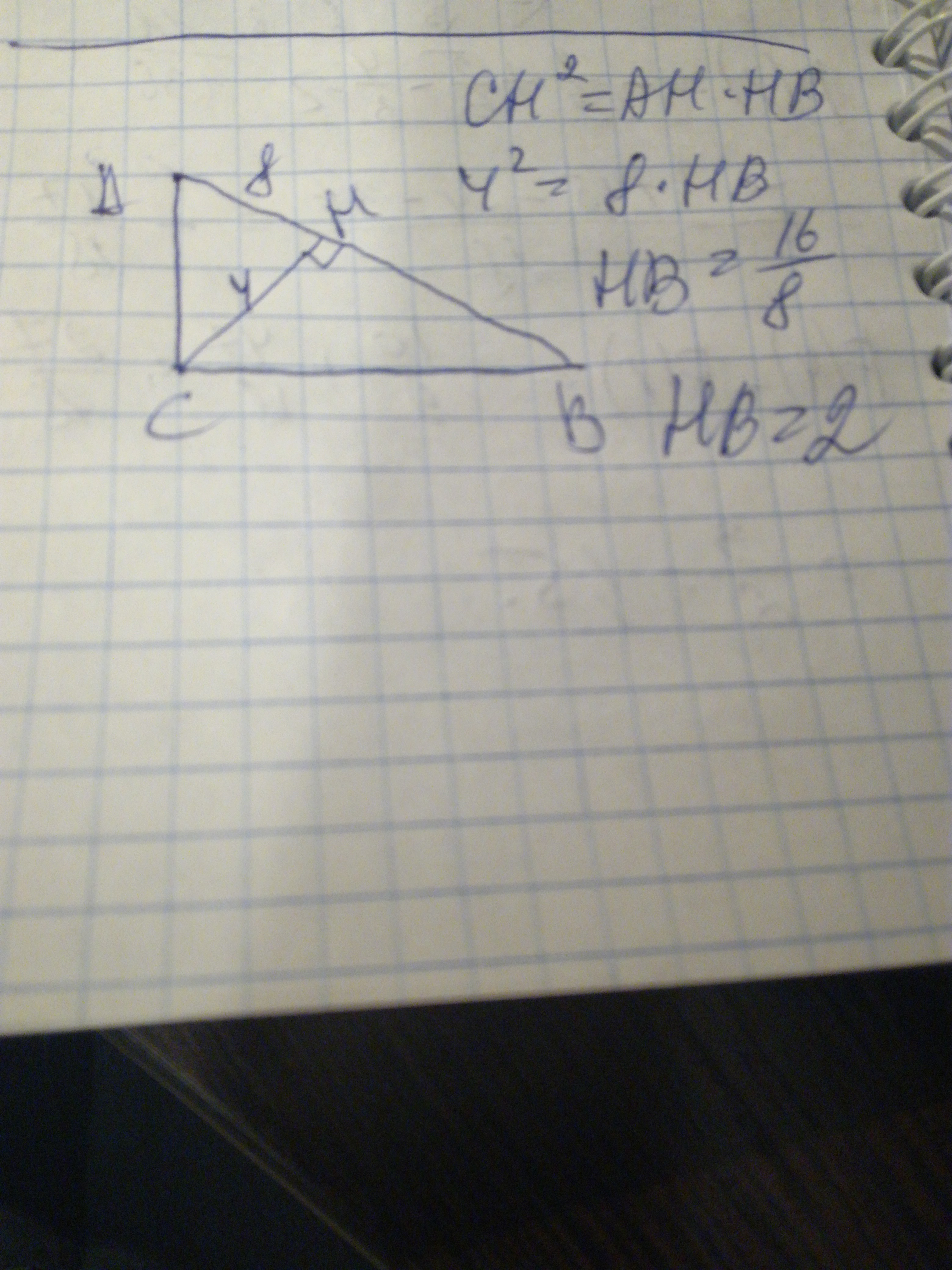 В прямоугольном треугольнике высота проведенная к гипотенузе равна 4 см,а один из отрезков,на которые высота поделила гипотенузу равен 8 см,найдите второй отрезок гипотенузы