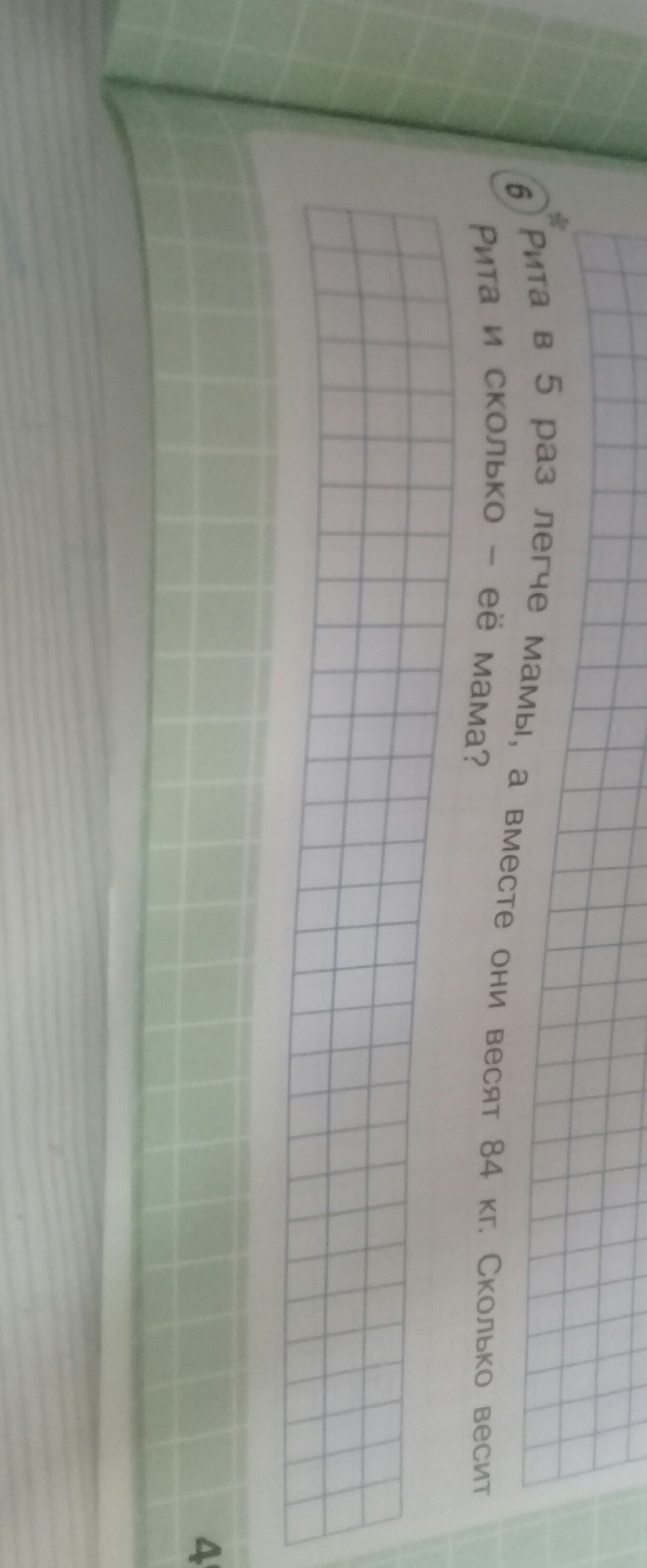 пусть Рита весит 1 часть,тогда мама весит -в 5 раз больше,-5 частей.