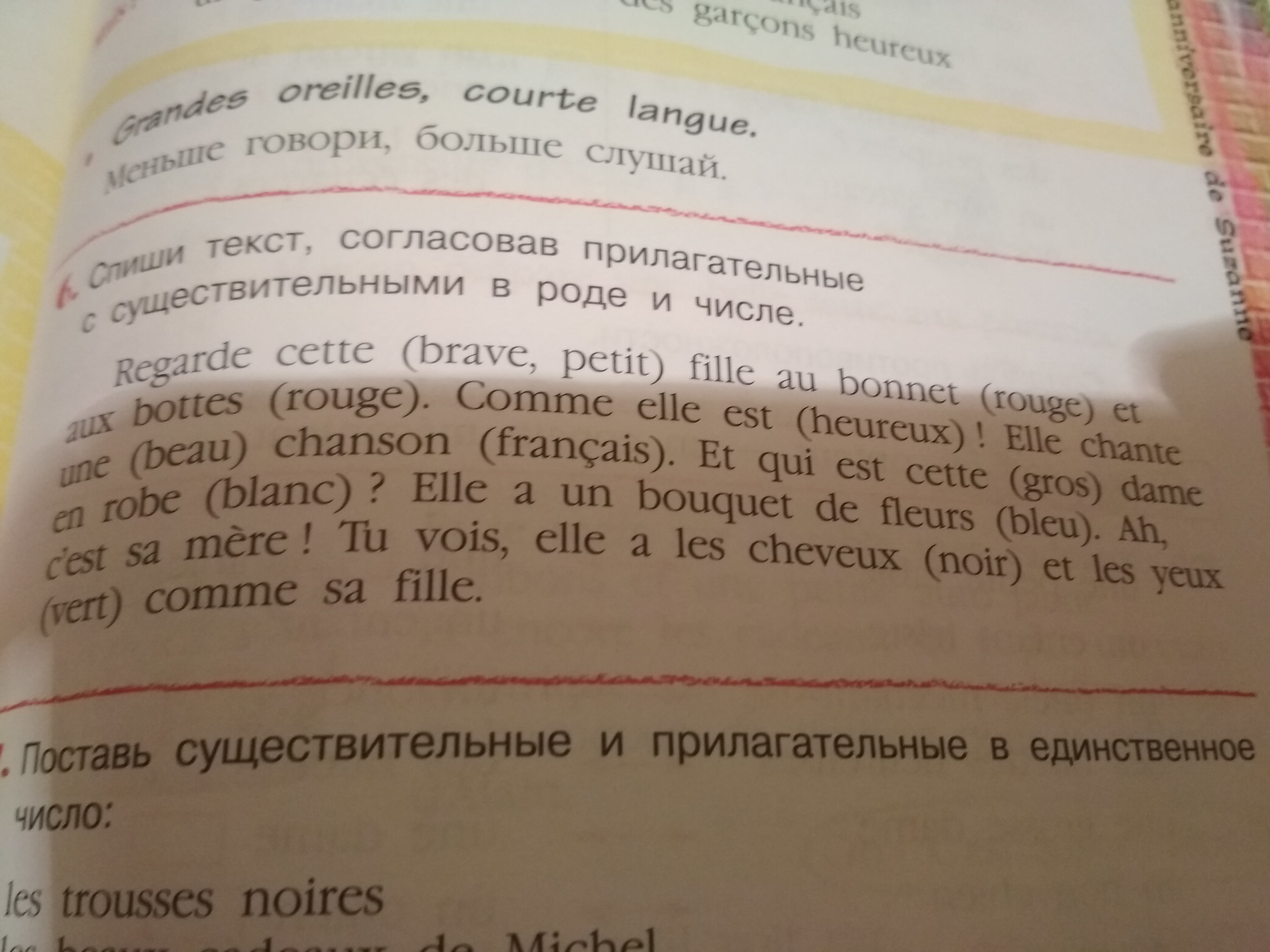 Regarde cette brave petite fille au bonnet rouge et aux bottes rouges. Comme elle est heureuse! Elle chante une belle chanson française . Et qui est cette grosse dame en robe blanche? Elle a un bouquet de fleurs blues. Ah, c'est sa mère ! Tu vois, elle a les cheveux noirs et les yeux verts comme sa fille.