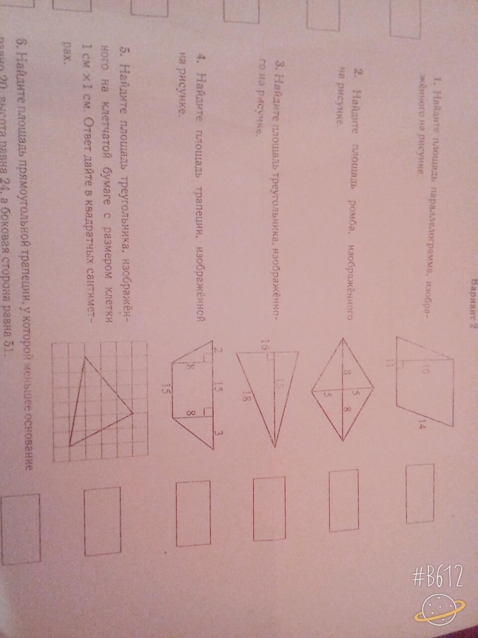 5.Площадь треугольника равна половине произведения его основания на высоту. Проводишь высоту из вершины и считаешь сколько клеток,полученное число и есть ответ :)