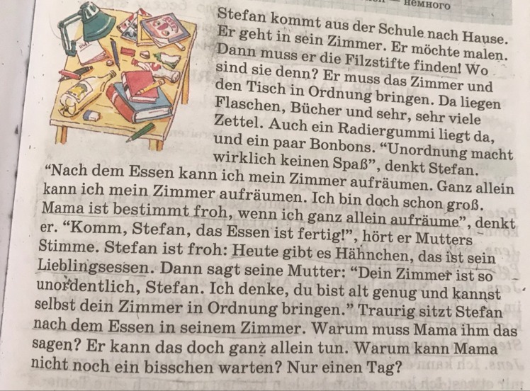 Стефан пришел из школы домой. Он идет в свою комнату. Он хочет рисовать. Он должен найти фломастеры. Где они ? Он должен навести порядок в комнате и на столе. Много бутылок, книг и очень много бумаги. Так же ластик и несколько конфет. "Беспорядок действительно не радует" считает Стефан. "После обеда я могу убрать свою комнату. я могу самостоятельно убрать свою комнату. я уже достаточно взрослый. Мама будет очень рада, если я сам все уберу", подумал он. "пойдем Стефан, еда готова.", услышал он голос мамы. Стефан рад: "Сегодня курица,его любимая еда". Затем его мама сказала: "В твоей комнате такой беспорядок,Стефан. Я думаю ты уже достаточно взрослый,чтобы сам убраться в комнате." Стефан сидел грустным в своей комнате после обеда.Почему мама должна была ему это сказать?он мог сделать это в одиночку.Почему мама не могла немного подождать?только один день?