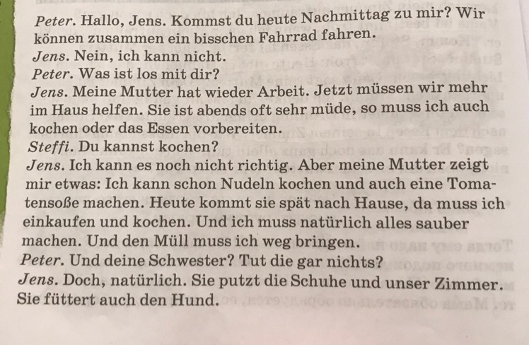 Йенс: Я могу, но еще не совсем хорошо (правильно). Но моя мама показала мне кое-что: я могу уже приготовить макароны и сделать томатный соус. Сегодня она придет домой поздно, поэтому мне надо сходить за покупками и приготовить еду. И, конечно, я должен все делать аккуратно. И мусор мне надо будет выбросить.