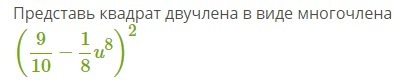 ( frac{9}{10}  -  frac{1}{8}  {u}^{8} )^{2}  =   \  = frac{81}{100}  - 2 times  frac{9}{10}  times  frac{1}{8}  {u}^{8}  +  frac{1}{64}  {u}^{16}  =  \  = frac{81}{100}  - frac{9}{40}  {u}^{8}  +  frac{1}{64}  {u}^{16}