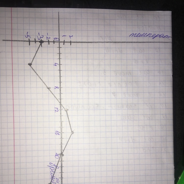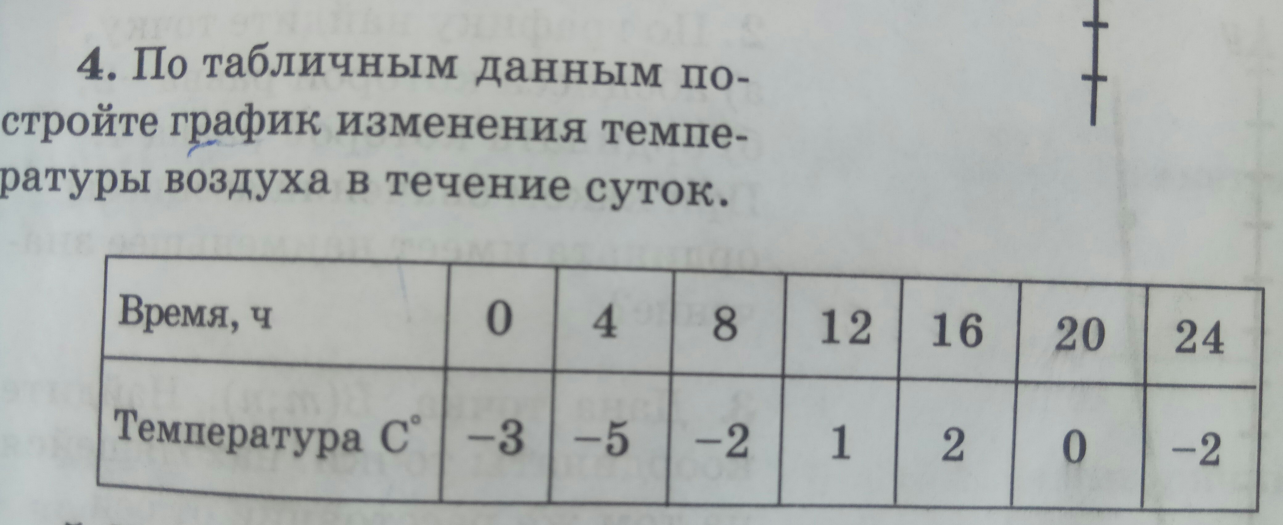 начерти горизонтальную линию и вертикальную. Точка пересечения - это 0. на горизонтальной через 1см отметь точки : 4,8,12,16,20,24. На вертикальной выше горизонтальной пойдут точки с плюсовой температурой: 1,2. А ниже горизонтальной- точки -1,-2, -3, -4, -5 Теперь соедини точк времени и точки температуры:0 часов и-3, 4часа и -5,8час и -2,12 час и +1, 16ч и +2,20ч и 0, 24ч и -2. Точки соединения этих линий и дадут тебе график.
